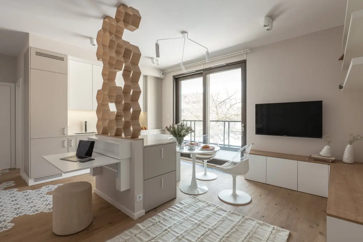 Powiększono małą kuchnie i wizualnie oddzielono ją od holu, a także wygospodarowano miejsce na owalny stół z krzesłami. W roli podziałów doskonale sprawdziła się lekka ścianka zbudowana z heksagonów – przylega do niej wyspa kuchenna z ciekawą zabudową oraz składane biurko do pracy. To ostatnie podyktowała potrzeba naszych czasów, w których praca zdalna staje się dla wielu standardowym, codziennym zjawiskiem. W mieszkaniu uzyskano dużo miejsca do przechowywania – subtelna zabudowa kuchni, sypialni oraz holu wtapia się w otoczenie.