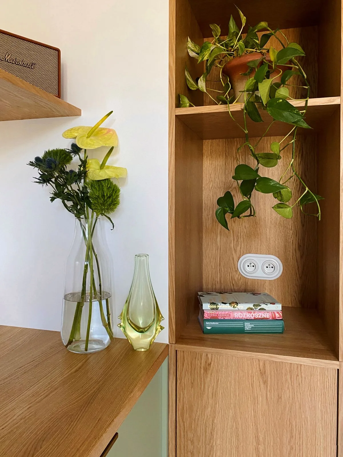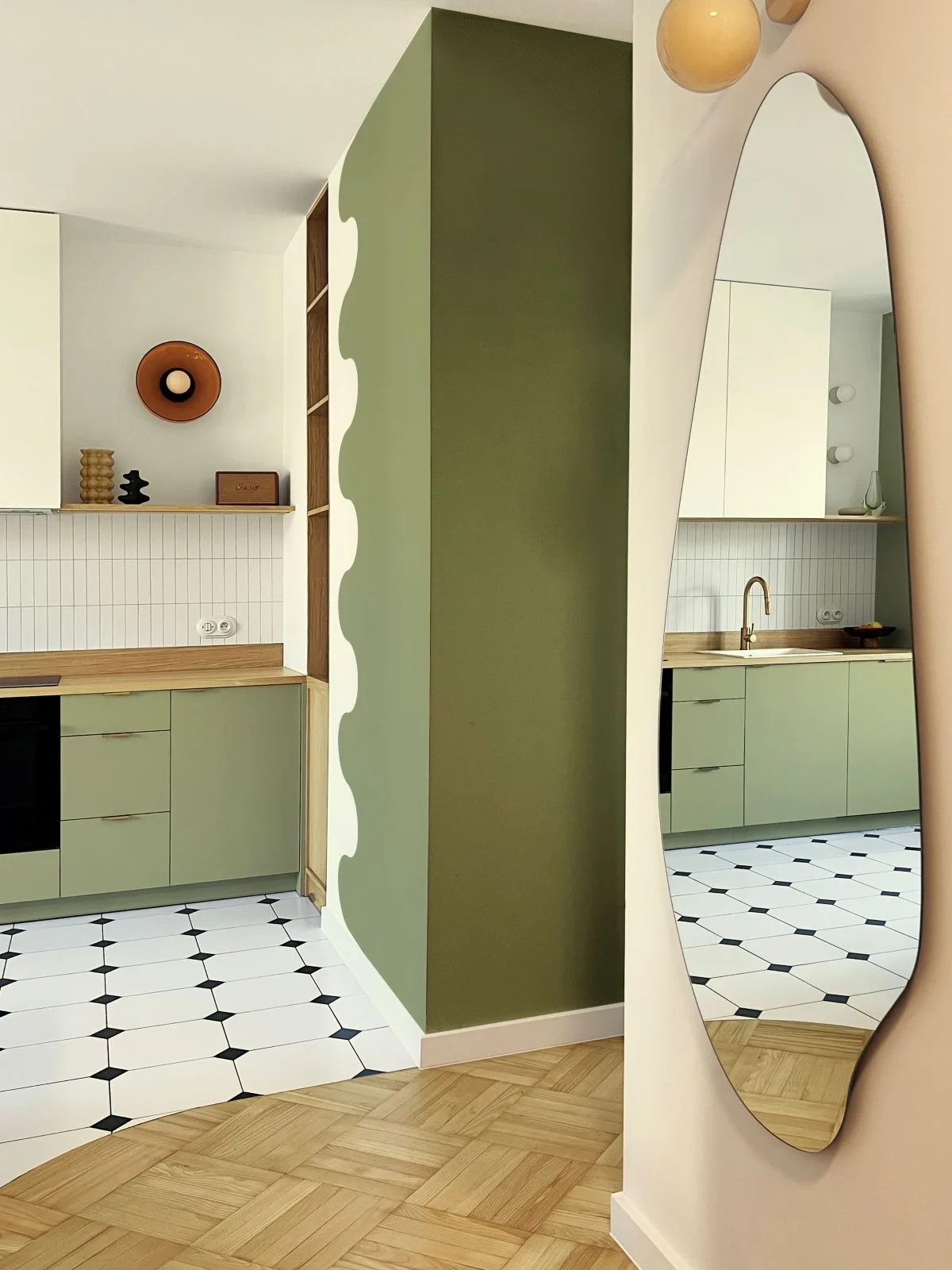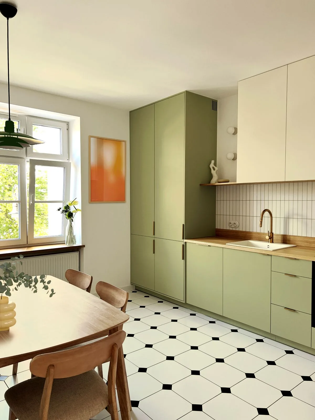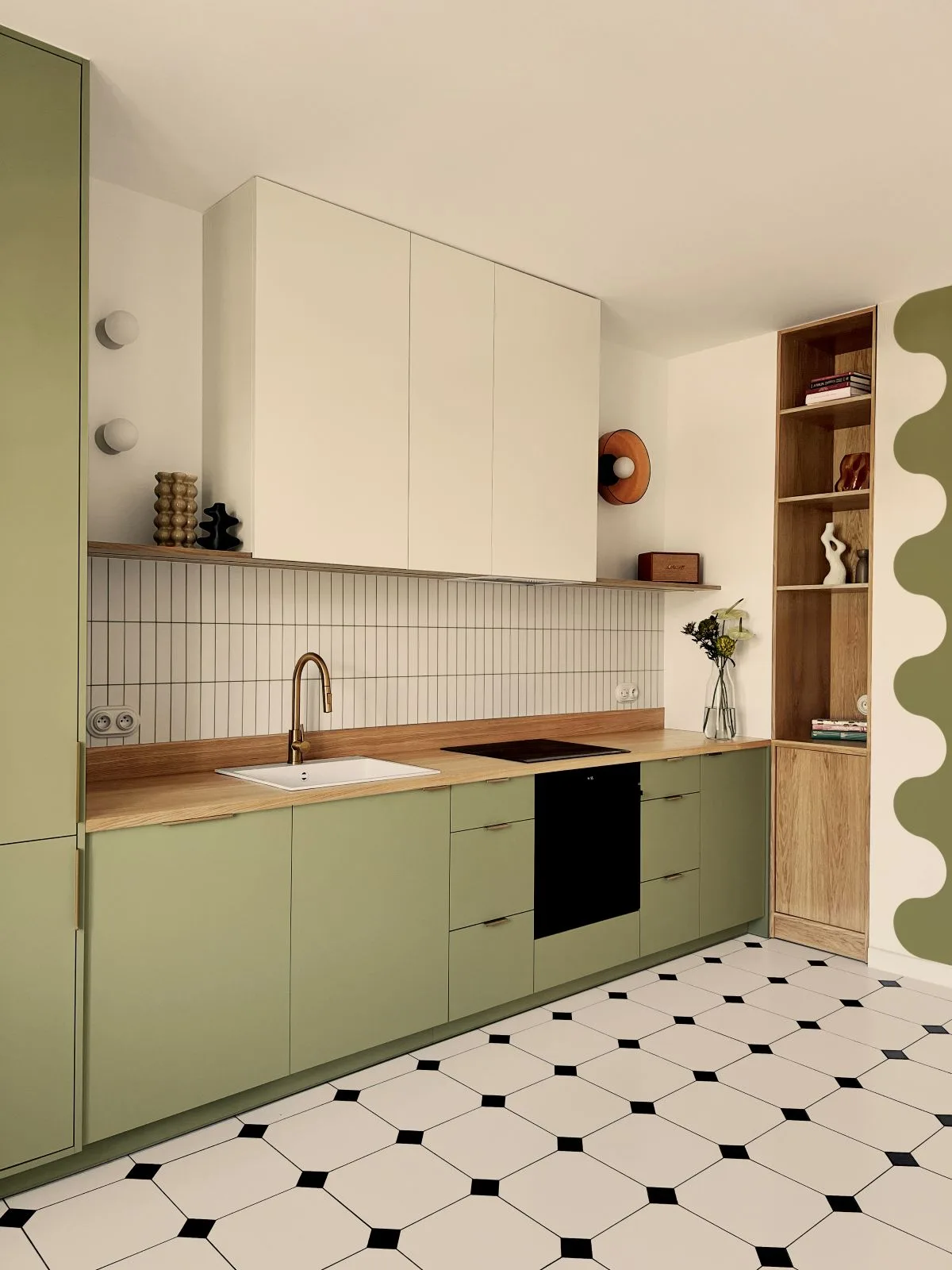 Dzięki połączeniu zieleni, naturalnego dębowego forniru i wyselekcjonowanych materiałów, kuchnia stała się sercem domu – miejscem codziennych rytuałów, spotkań i rozmów.