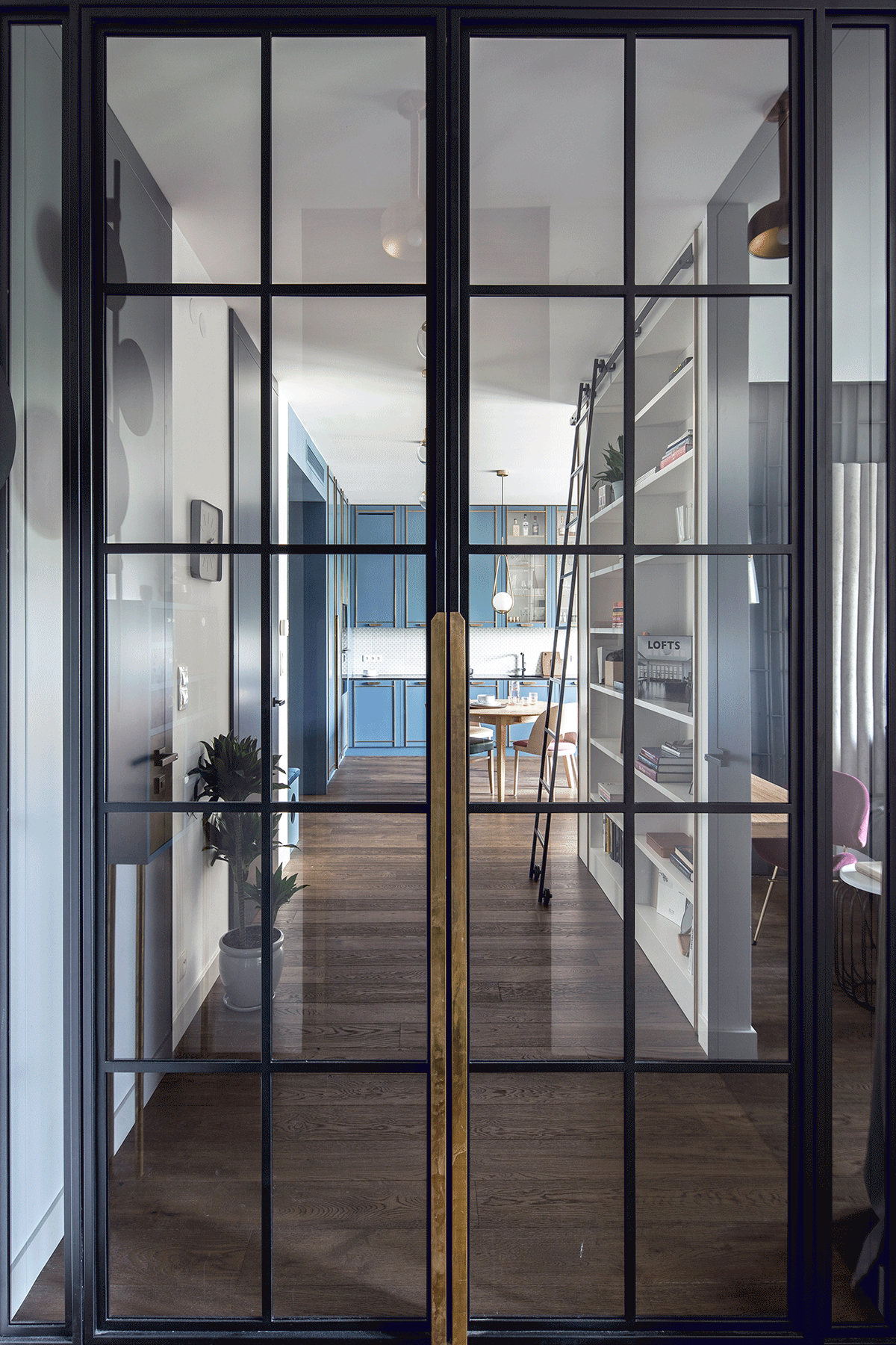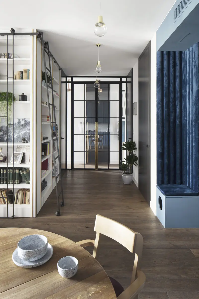 Centralne miejsce tego 84 – metrowego mieszkania dumnie dzierży strefa dzienna. Na otwartej i pełnej światła przestrzeni znajdziemy salon, jadalnię i niebiesko – błękitny aneks kuchenny. Meble zyskują na eleganckim wyglądzie dzięki mosiężnym wykończeniom. W tym samym kolorze jest oprawa wisząca nad stołem. Niezwykłą przytulność oddziałującą na całe mieszkanie architekci uzyskali, sięgając po sprawdzone rozwiązanie, jakim jest drewniana podłoga i jadalnia, gdzieniegdzie mocniej zaakcentowana tapicerką na krzesłach.