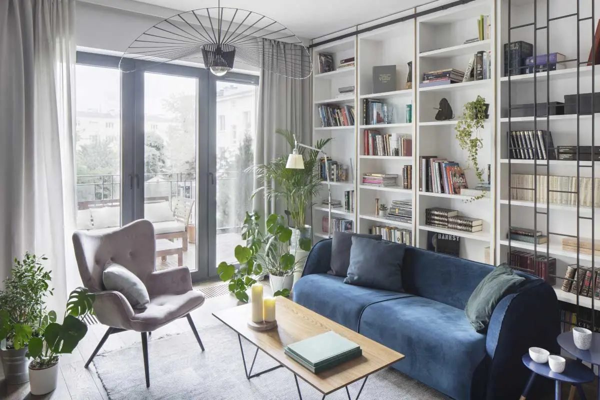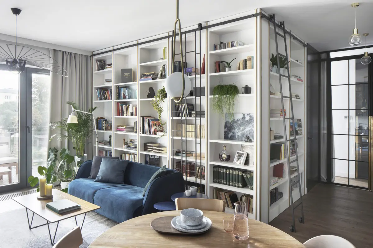 Najwięcej uwagi w strefie wypoczynkowej przykuwa efektowny regał, którego początek znajdziemy już w holu. Domowa biblioteczka zachwyca nie tylko swoim projektem, ale też imponującym zbiorem książek, który wręcz hipnotyzuje i zachęca do tego, aby zostać tu na dłużej i zanurzyć się wygodnej sofie z ulubioną lekturą w ręku. A widok jest zacny: z jednej strony możemy podziwiać uroki Warszawy przez duże okna, z drugiej mamy zachwycającą kuchnię.