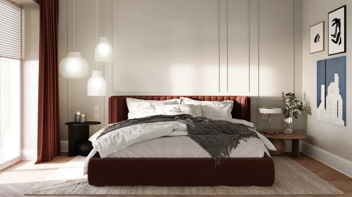 Bordo powstały z połączenia ognistej czerwieni i mrocznej czerni, jak za dotknięciem czarodziejskiej różdżki, wprowadza do wnętrza buduarowy klimat. Szczególnie, gdy pojawia się w formie velvetowych zasłon i eleganckiego wezgłowia wieńczącego sypialniane łoże.