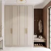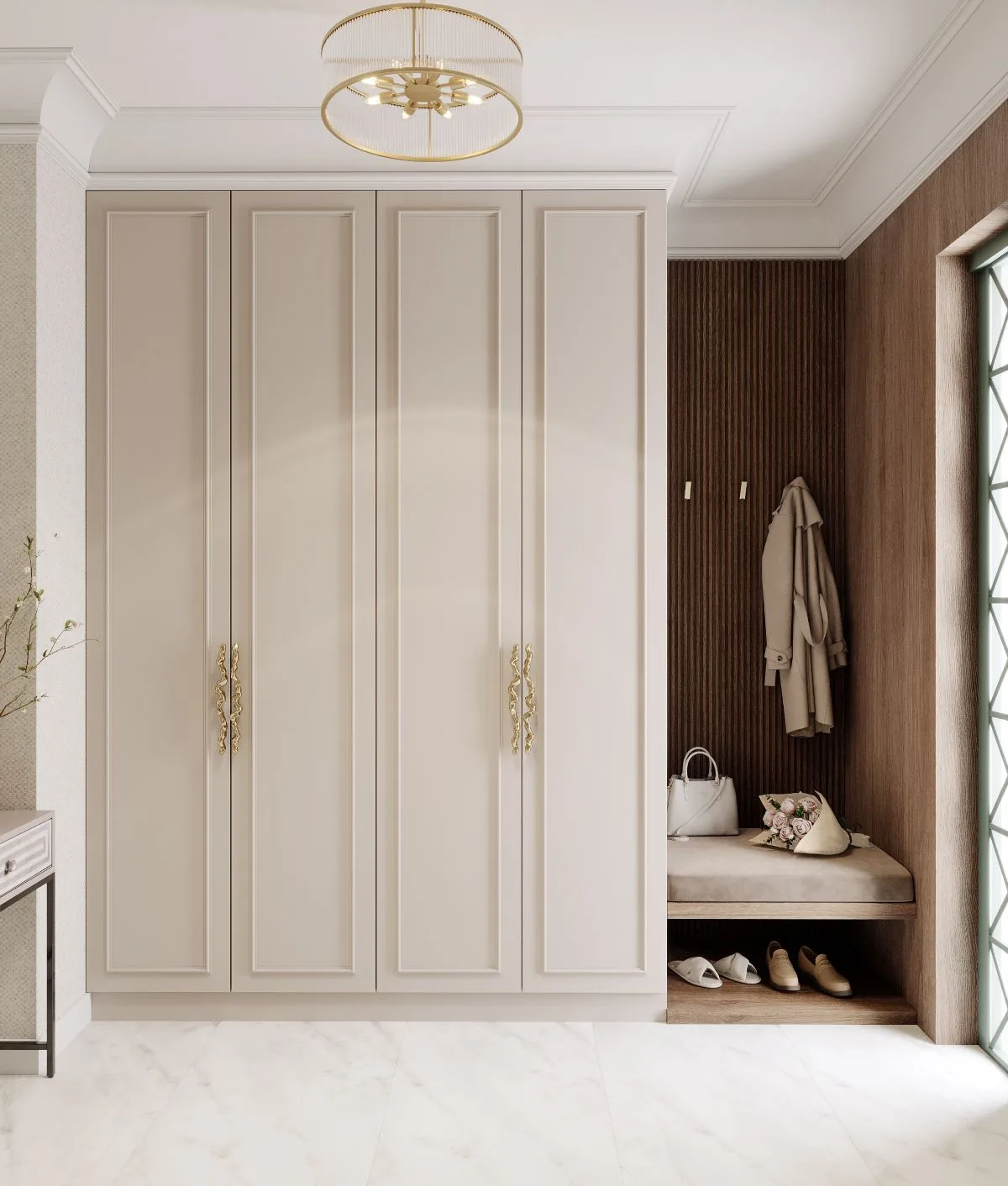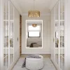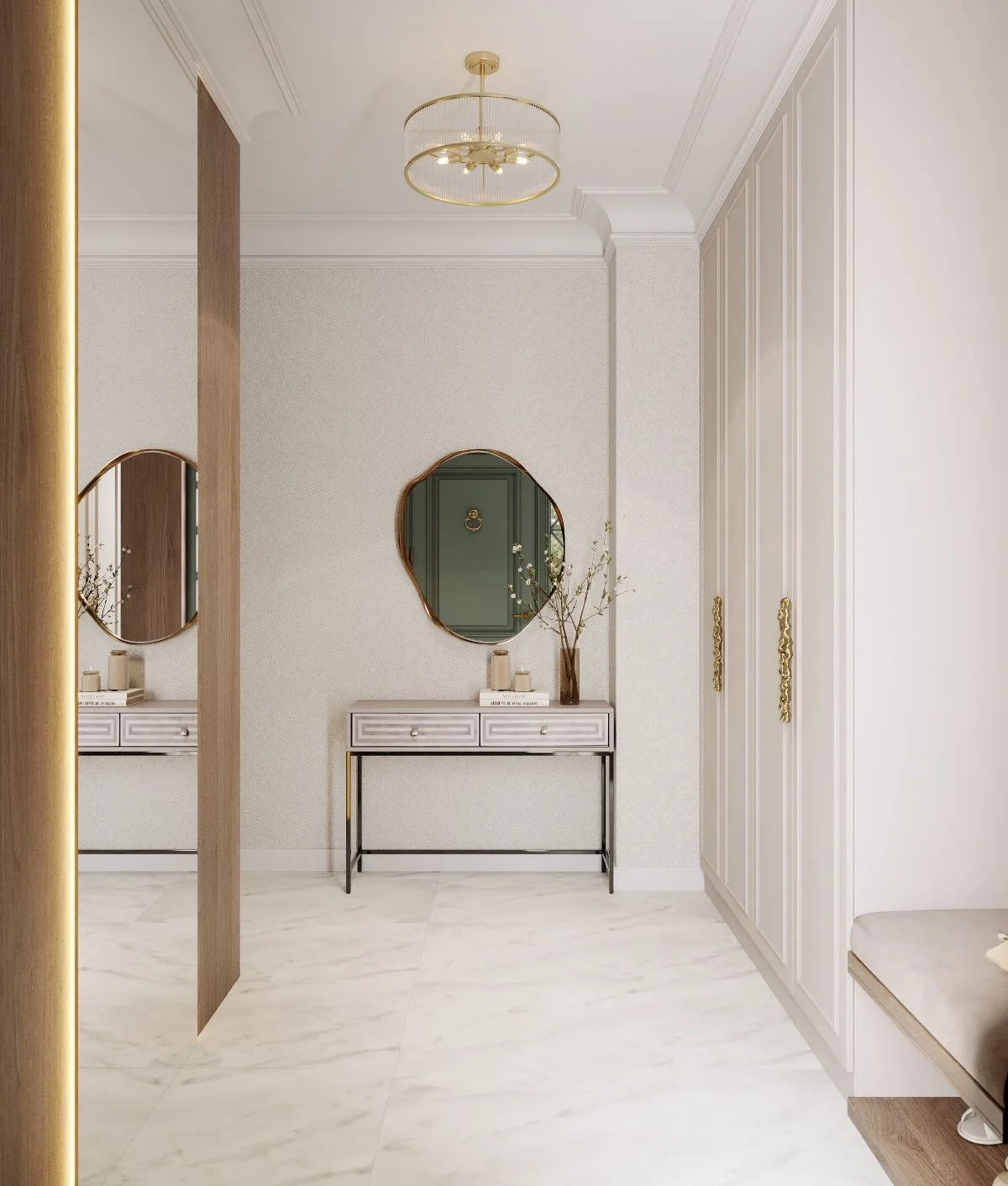 Już w wiatrołapie rozpoczyna się historia domu. Paleta ciepłych beży i naturalnego drewna wita gości w sposób subtelny i gościnny. Drzwi w odcieniu zgaszonej zieleni stanowią mocny akcent – niczym zapowiedź harmonii z naturą. Strukturalna tapeta i gra luster o różnym charakterze wprowadzają dynamikę światła i perspektyw, delikatnie otwierając wnętrze.