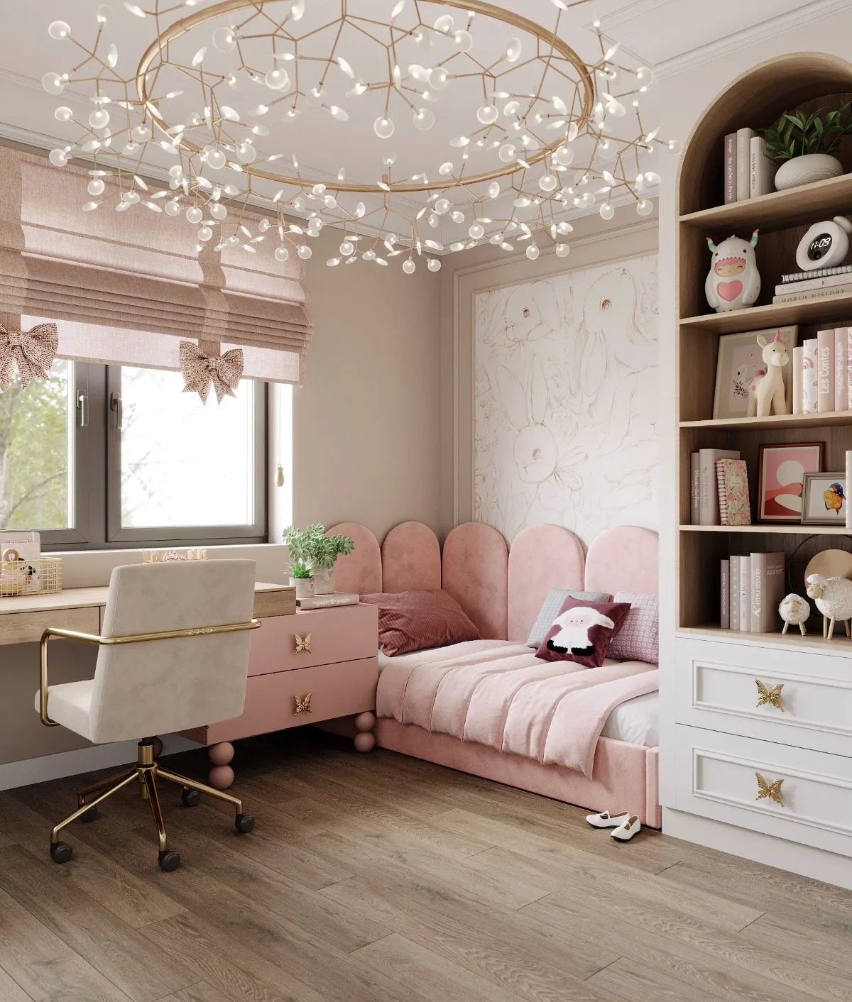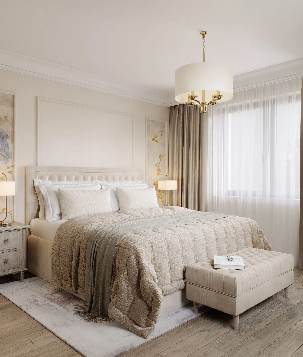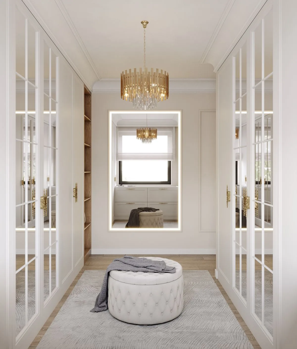 Na piętrze rozciąga się królestwo prywatności domowników. Sypialnia w odcieniach bieli, beżu, zieleni i błękitu zachwyca elegancką tapetą ujętą w ramy sztukaterii, a ukryta garderoba z bielą, złotem i lustrami staje się luksusowym azylem.