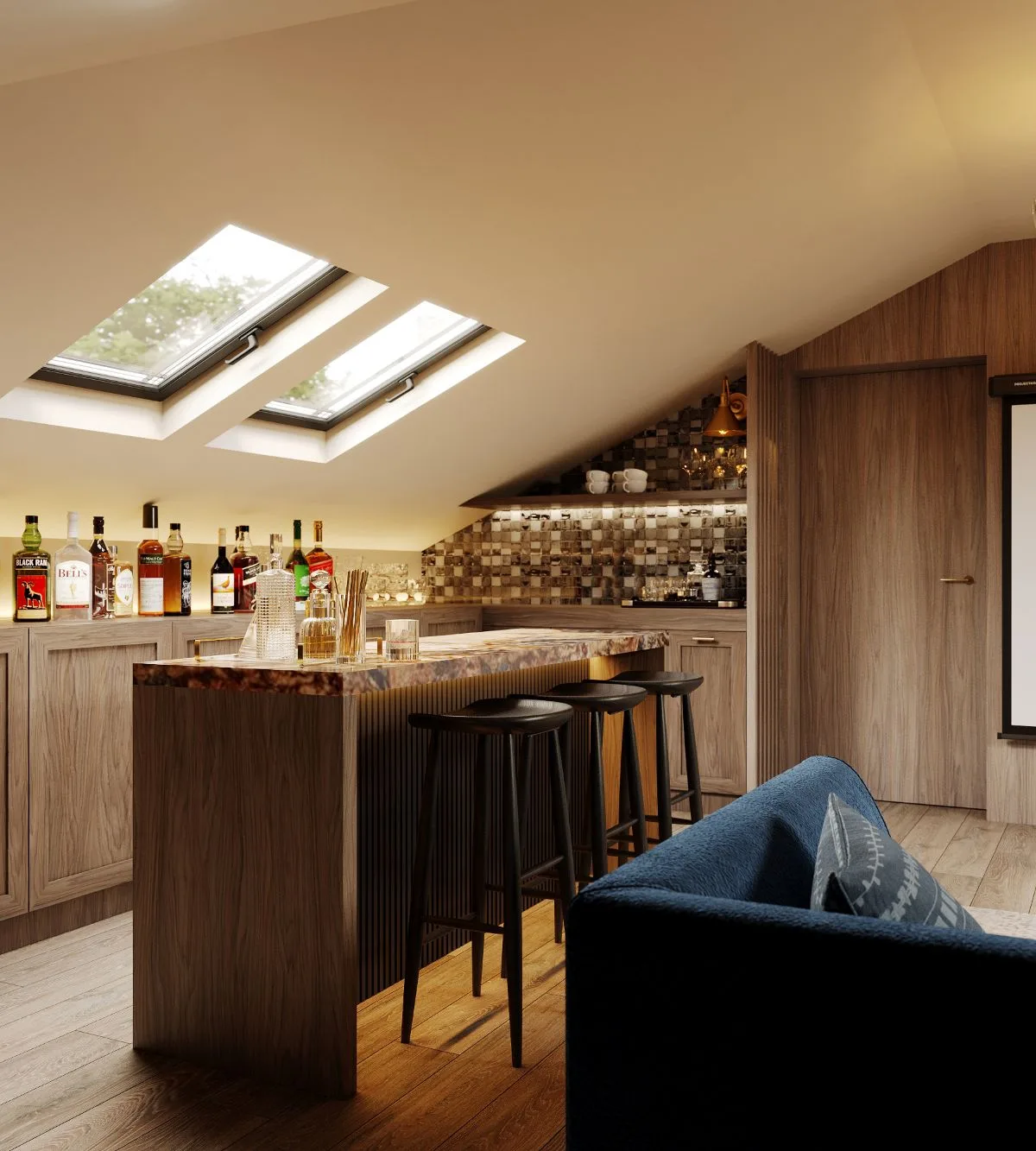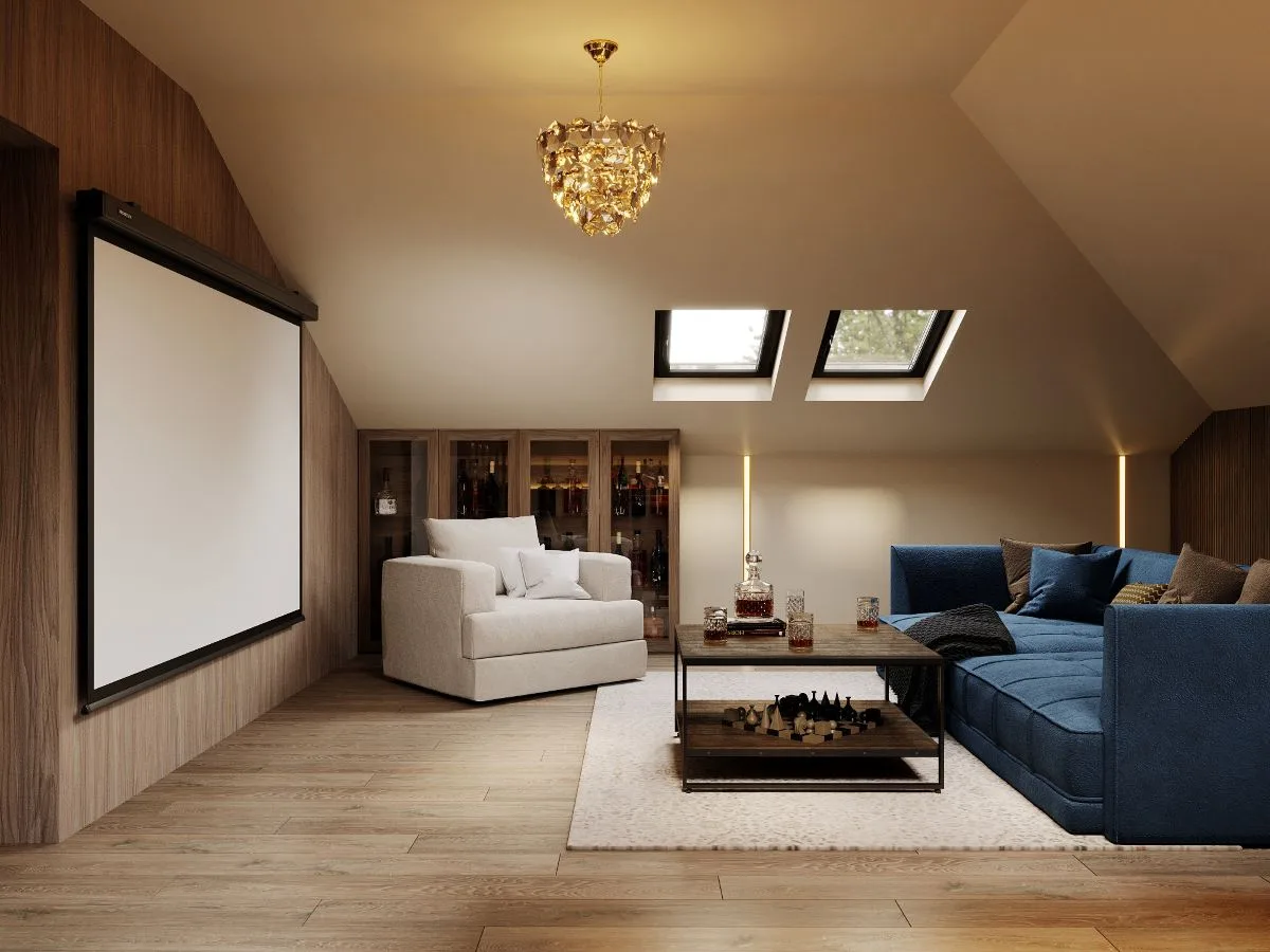 Najbardziej intrygującą częścią piętra jest jednak pokój rekreacyjny – spełnione marzenie o „sekretnym barze”. Tu, w otoczeniu strefy kina i baru, czas spowalnia, a przestrzeń staje się miejscem spotkań i radości.