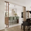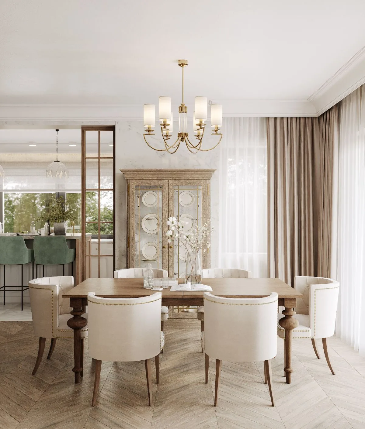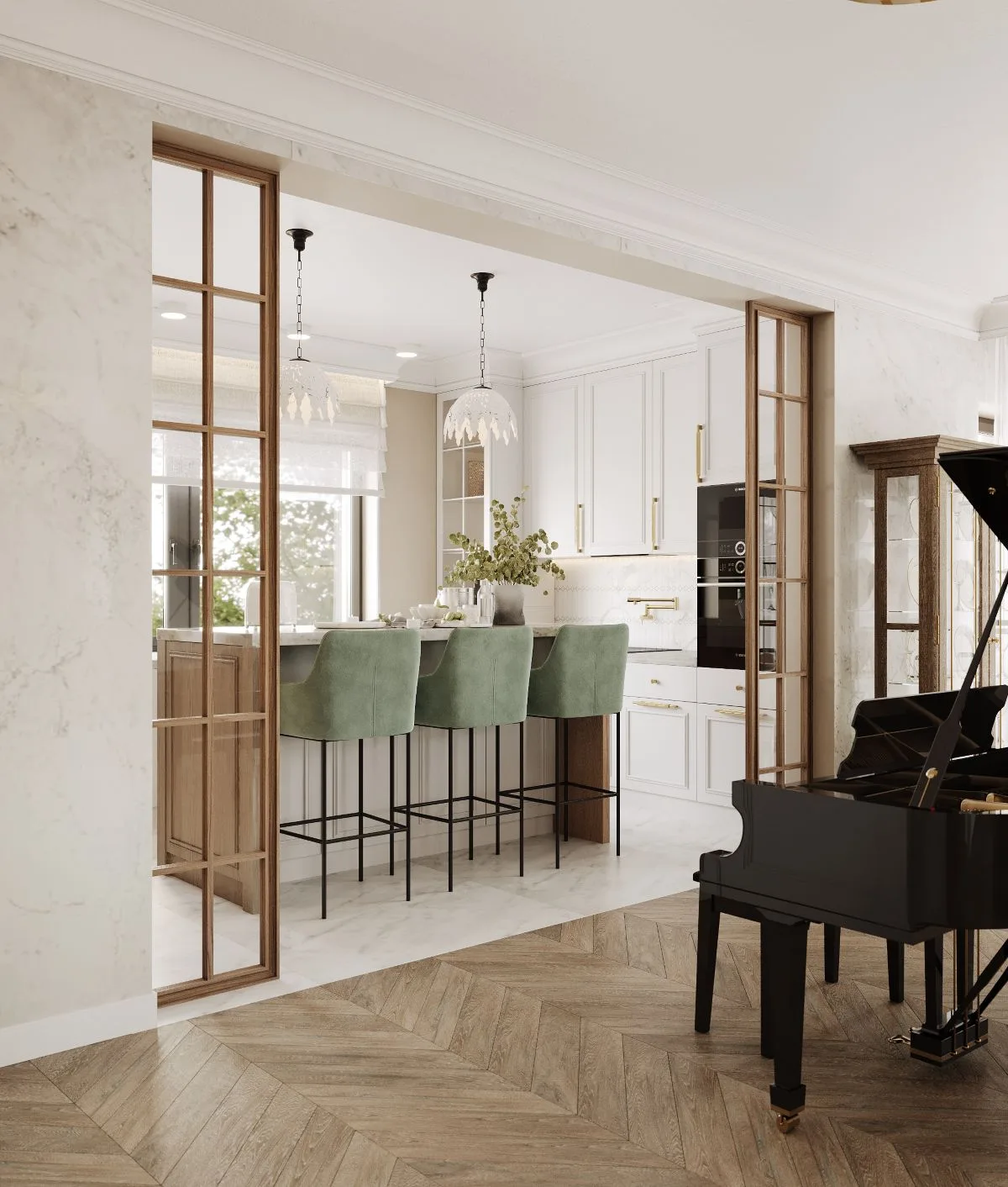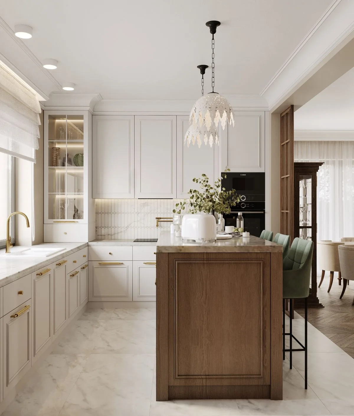 Kuchnia, jadalnia, salon i gabinet płynnie przechodzą jeden w drugi, tworząc spójną, stylistyczną narrację. W kuchni ponadczasowa biel spotyka się z ciepłem drewna, a mozaika od Raw Decor i złote akcenty nadają wnętrzu wyrafinowania. Lampy w stylu Tiffany’ego wprowadzają aurę ponadczasowej elegancji – jak most łączący przeszłość z teraźniejszością.
