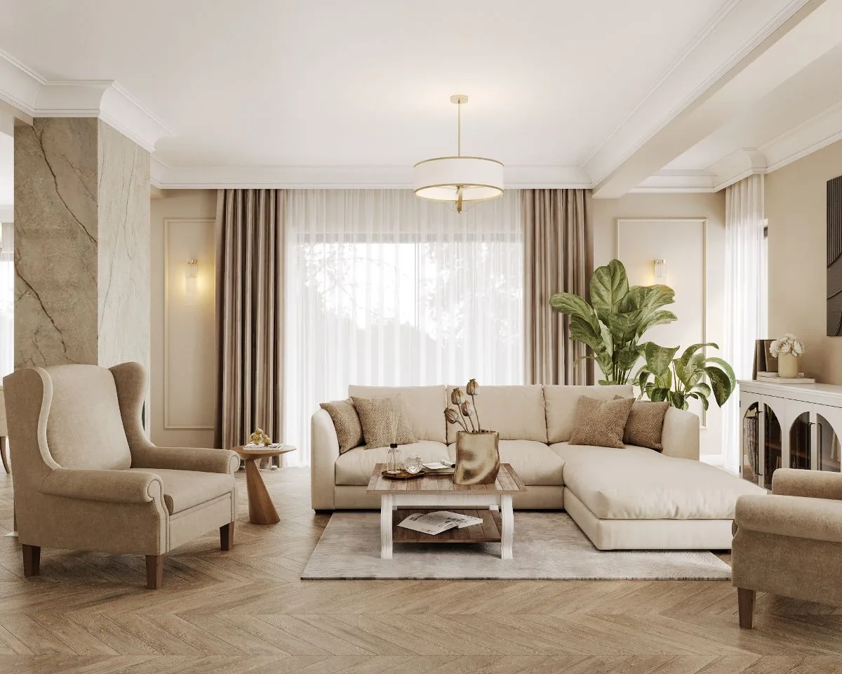 W jadalni na tle wielkoformatowych płyt od Marazzi i sztukaterii od Orac pojawiają się antyki i klasyczne lampy od Kutek Classic. To przestrzeń, w której intymność spotkań przy stole nabiera eleganckiego charakteru. Salon z kolei staje się oazą spokoju – neutralne beże, strukturalna tapeta i sztukateria tworzą przestrzeń do relaksu i odpoczynku.