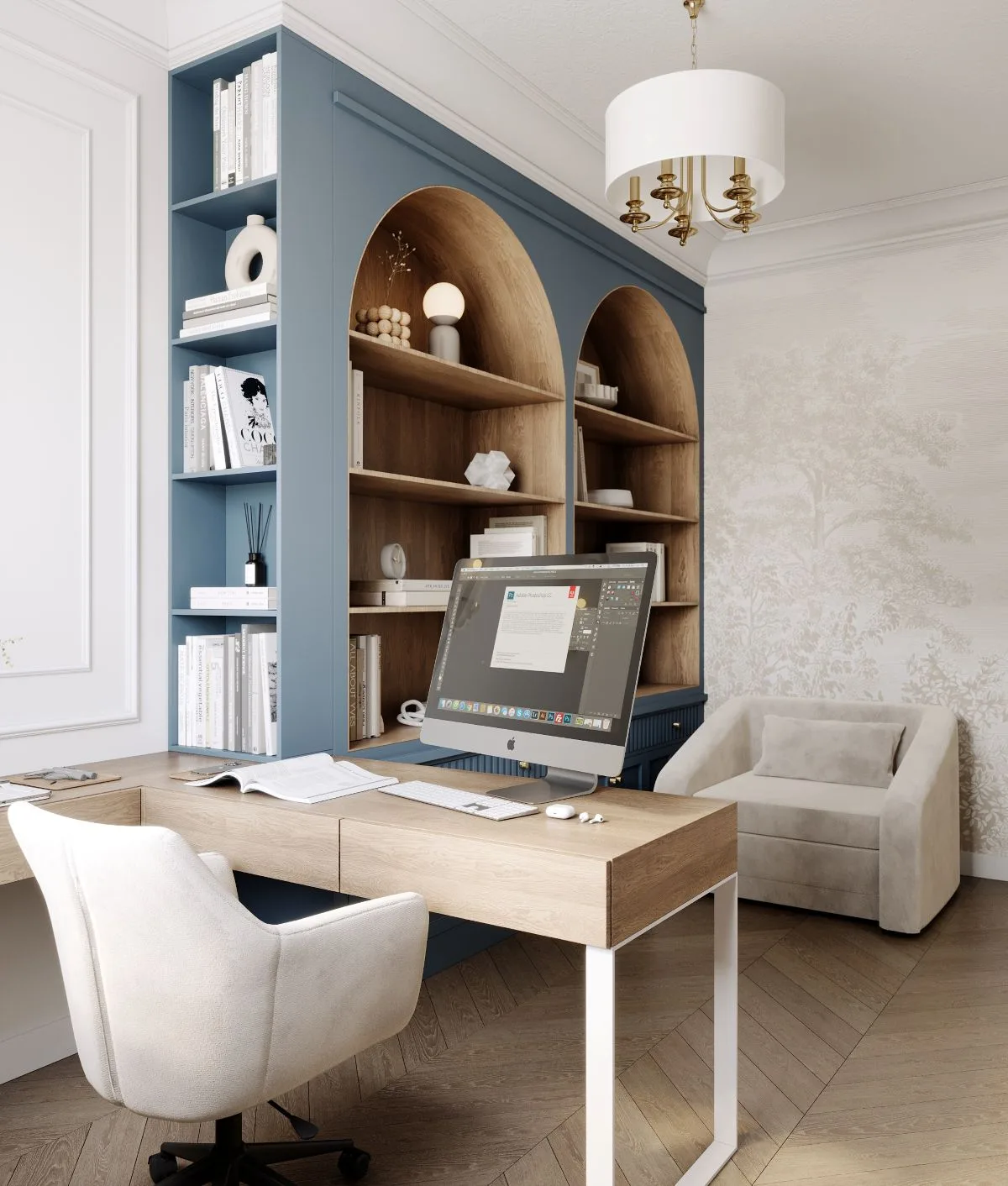 Gabinet, pełniący również funkcję pokoju gościnnego, wyróżnia się subtelnym przejściem kolorystycznym – od beżu do błękitu. To delikatny gest projektantki, który dodaje wnętrzu lekkości i indywidualnego wyrazu.