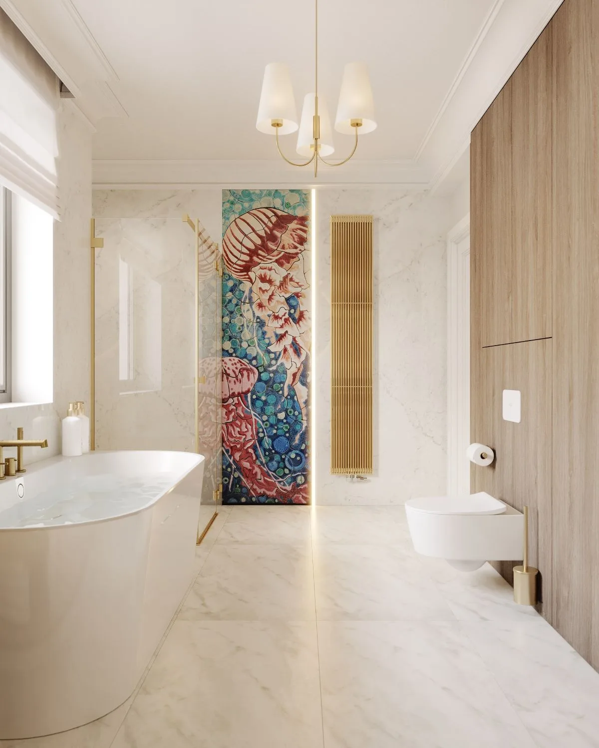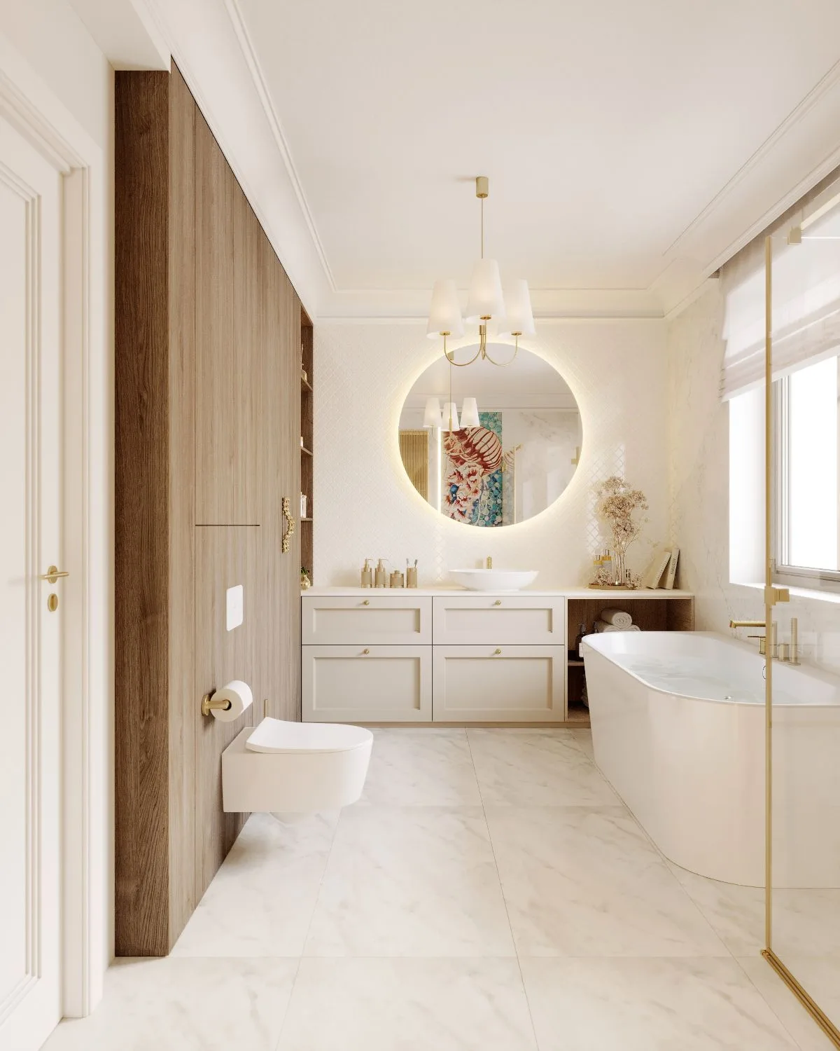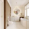 Główna łazienka to prawdziwa świątynia elegancji. Dzieło utalentowanej Stefanii Michałowskiej znalazło swoje miejsce obok płyt od Marazzi, tworząc osobistą galerię sztuki. Biel, beż, zieleń i błękit dopełnia szczotkowana armatura od Gessi, która lśni niczym biżuteria. Wolnostojąca wanna zaprasza do relaksu, a umywalka od Villeroy & Boch z podświetlanym lustrem dopełnia obrazu nowoczesnego komfortu.