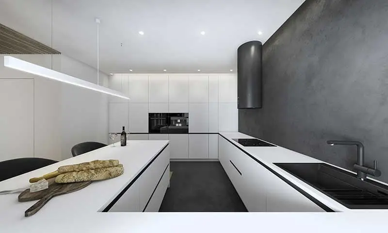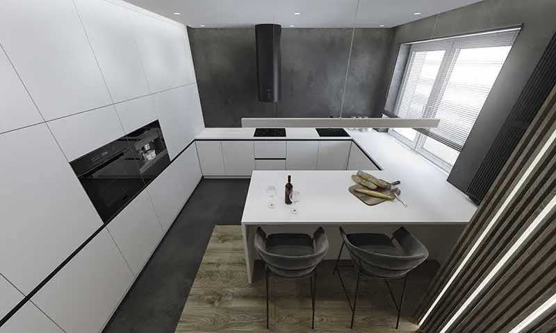 W kuchni zostały użyte białe fronty w mieszanym systemie otwierania, tzn. dolny pas szafek otwiera się dzięki zacięciu frontu na 45stopni, pod którym pojawia się ciemny grafitowy korpus szafek. Natomiast górne szafki otwierane są za pomocą systemu TipOn, co pozwala w pełni zrezygnować z uchwytów, zapewniając minimalistyczny wygląd zabudowy. Kuchnia została zaprojektowana w kształcie litery C, z dopełnieniem w postaci wysokiej zabudowy, która pośrednio zamyka ją w całość, tworząc „zamknięty” obwód. Wyspa kuchenna w pełni wykorzystuje przestrzeń kuchni, umożliwiając tym samym stworzenie miejsca do spożywania posiłków, ale także gwarantuję dyskrecję. Ważną rolę pełni w tym pomieszczeniu oświetlenie, które zostało wykorzystane w postaci kilku kryteriów, m.in. oprawy natynkowe wpuszczane w sufit podwieszany, oświetlenie led po obwodzie sufitu podwieszanego oraz wisząca minimalistyczna lampa producenta Aqform. Dekoracyjnego efektu dodają tapicerowane welurowe hokery oraz nowoczesny grzejnik z pionowymi przęsłami i wieszakiem.