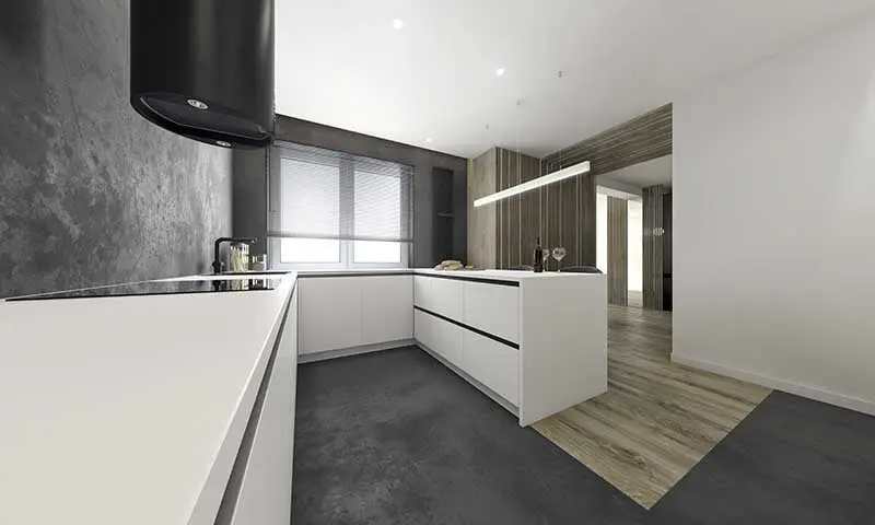 Do realizacji kuchni wykorzystany został mikrocement, który zastępuje płytki, dzięki czemu możemy uzyskać jednolite płaszczyzny pozbawione spoin i fug. Ten materiał znajduje się także na podłodze. Podłogę definiują także panele laminowane o podwyższonych właściwościach na ścieranie, w kolorze zimnego drewna z widocznymi sękami. Dzięki ich zastosowaniu, pomieszczenie jest cieplejsze w odbiorze. Między lamelami zostało wprowadzone światło led, które umiejętnie tworzy grę świateł i podkreśla wejście do kuchni, w sposób symboliczny tworząc portal.