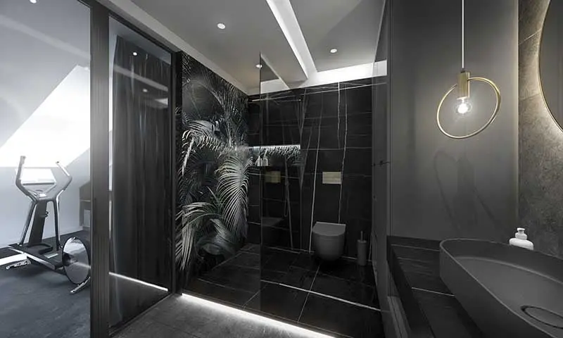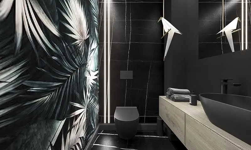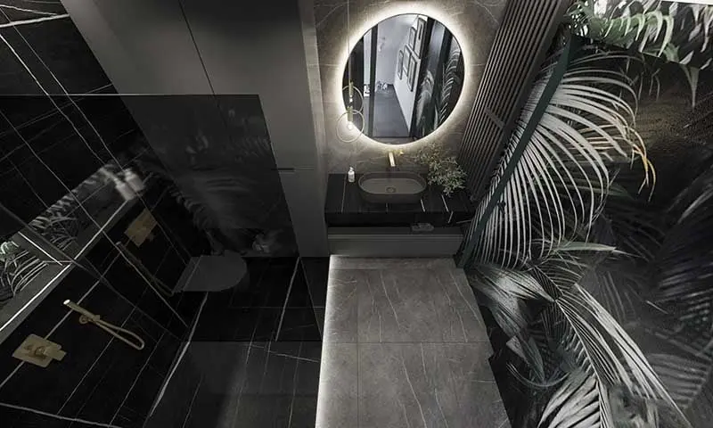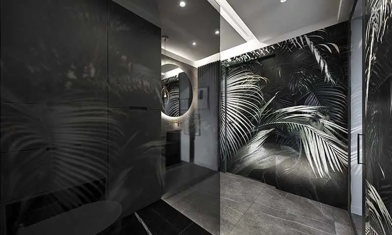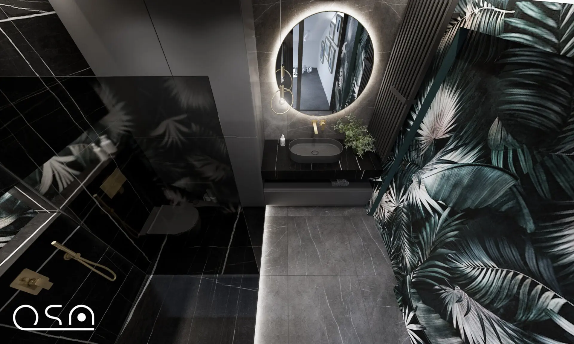 W przestrzeni łazienkowej wykorzystano płytki wielkoformatowe. Kafle mają widoczne, regularne żyłowanie, ale bardzo delikatne dzięki czemu w subtelny sposób dekorują pionowe przegrody. W łazience użyto dwóch typów kafli: szarości i czerni. Przestrzeń ścian w łazience zdobi także tapeta w dekoracyjne liście, w której dominującym kolorem jest zielony.