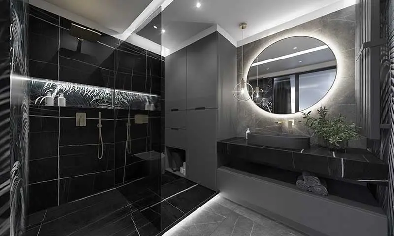 Za nim powstanie końcowy efekt projektu, należy przeprowadzić szereg dyskusji, prób projektowych, wizyt w showroomach i sprawdzania najlepszej drogi. Ten minimalistyczny apartament dzięki wykorzystaniu gradientu koloru czarnego, kamiennych płaszczyzn, wzbogaconych w elementy jasnego drewna oraz złotego koloru armatury, stał się luksusowy, ale przy tym bardzo powściągliwy. Ważną rolę odgrywa także kolorowa ceramika. W projekcie, użyta została w kolorze czarnym.