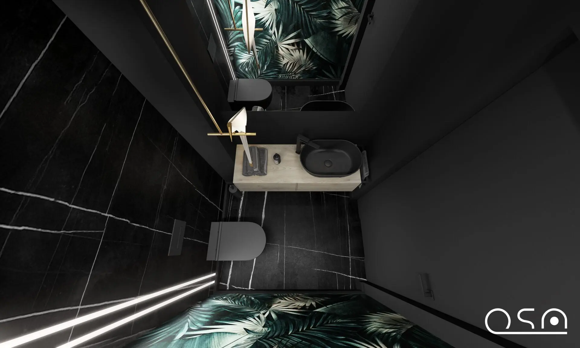 WC jest spójne z aranżacją łazienki lecz ze względu na mniejszą powierzchnię mniej dekoracyjne. Przestrzeń powstała przy użyciu kafli w kolorze czarnym, bujnej tapety oraz czarnej farby. W tym pomieszczeniu dużą rolę odgrywa również światło, tutaj w postaci led zostało wykorzystane zarówno w pionowych przegrodach- ścianach, ale także w poziomych- sufitach, dzięki czemu tworzy ciekawy efekt wizualny, ale i kontynuację. Dużej pikanterii temu miejscu zapewnia lampa wisząca w postaci papugi, producenta King Home- model Loro 1. Ten rodzaj oświetlenia znakomicie komponuję się z florystyczną tapetą. tu również znajduje się czarna ceramika. Tło i głębię zapewniają czarne ściany malowane farbą, natomiast optyczne powiększenie przestrzeni i drugi plan tworzy proste lustro, zrównane z licem ściany.