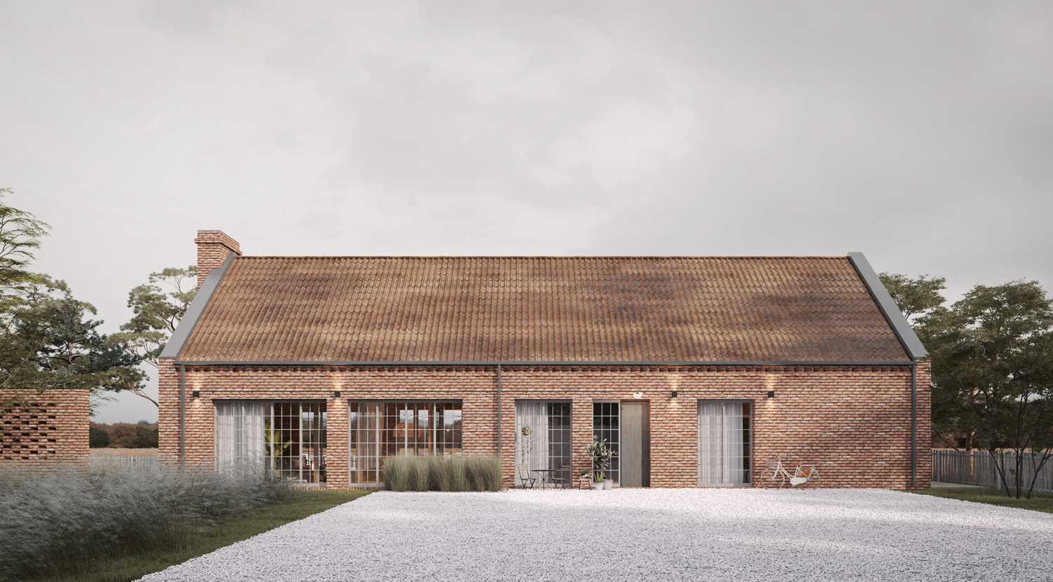 Dom z cegły rozbiórkowej to natomiast kompletnie inna historia. Zaadaptowaliśmy stare siedlisko pod Gałkowem i wraz z wolą inwestorów w miejscu starej stodoły stworzyliśmy nowy dom z uwzględnieniem cegły rozbiórkowej, starej więźby dachowej od wewnątrz, ale za to z otoczeniem zaprojektowanym już w nowoczesny sposób lecz wciąż ze starego materiału, który dominuje w okolicy.