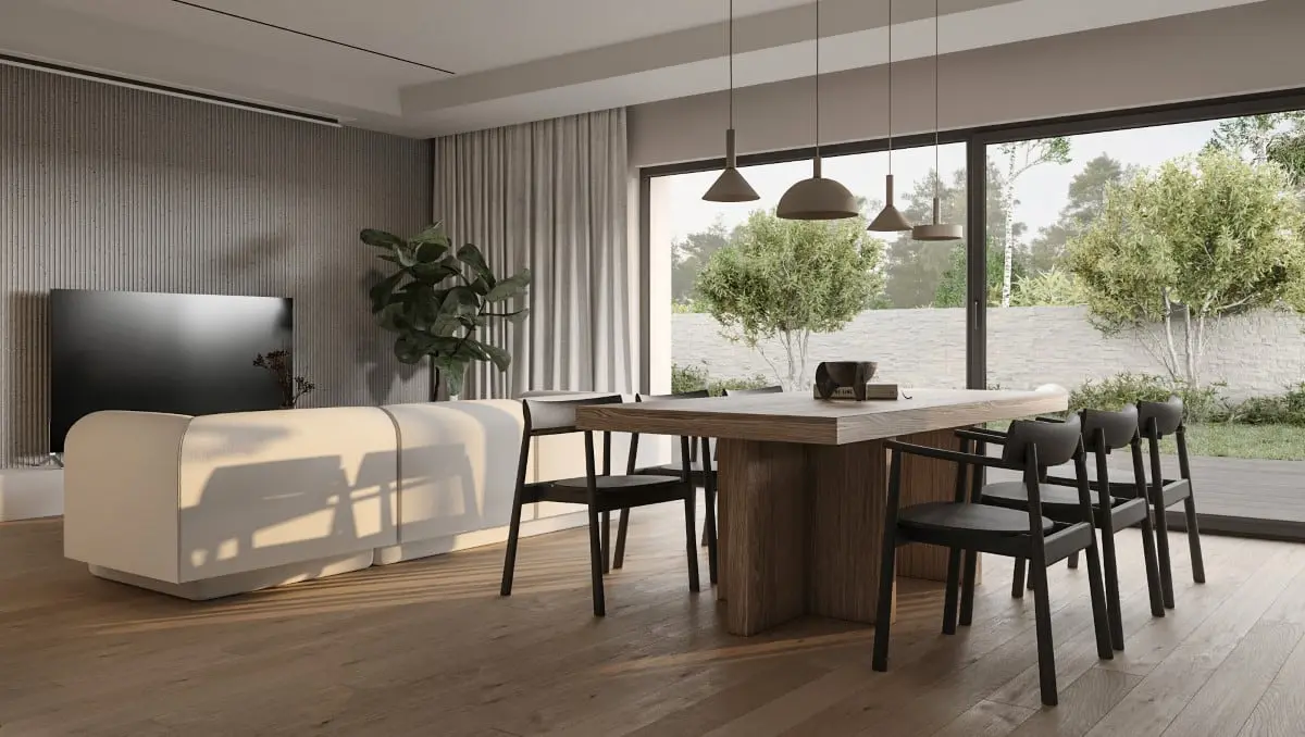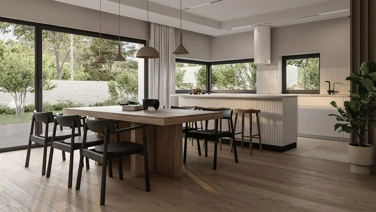 Sercem domu jest przestronna strefa dzienna. Życie domowników rozgrywa się wokół dużego monolitycznego stołu. Jego naturalny wręcz ,,ciosany” design dopełniają czarne krzesła. W tle znajduje się minimalistyczna kuchnia z wyspą. Jej geometryczną formę podkreśla frezowanie na wyspie oraz płytki w stylu ,,kit kat” na ścianie nad blatem.