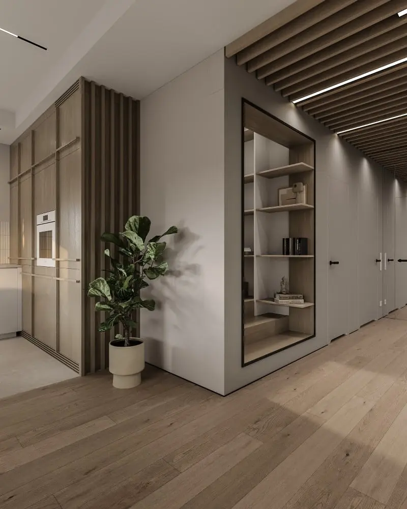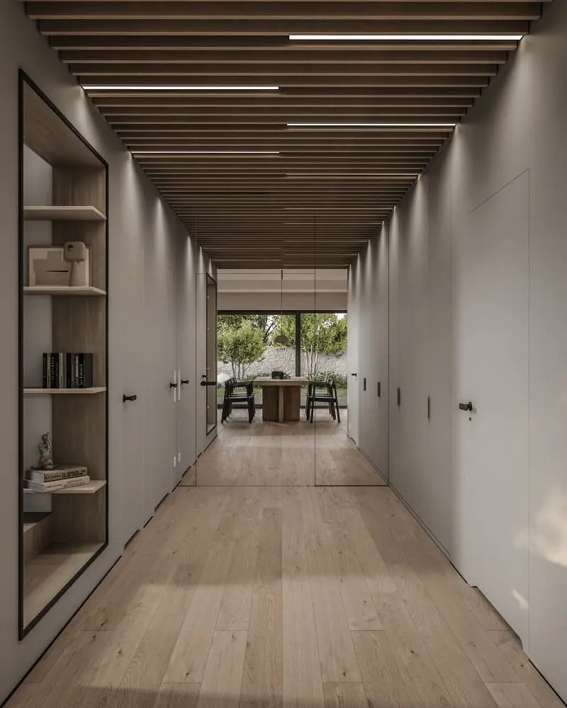 Przedpokój również zachwyca. Oczywiście efekt ,,wow” udało się osiągnąć dzięki oszczędnym środkom wyrazu, hołdując dewizie ,,less is more”. Tu, podobnie jak w większości pomieszczeń, na podłodze znalazły się deski. Jednak drewno pojawia się także w mniej oczywistej formie – na suficie w postaci modnych lameli, pomiędzy którymi są zainstalowane listwy LED.