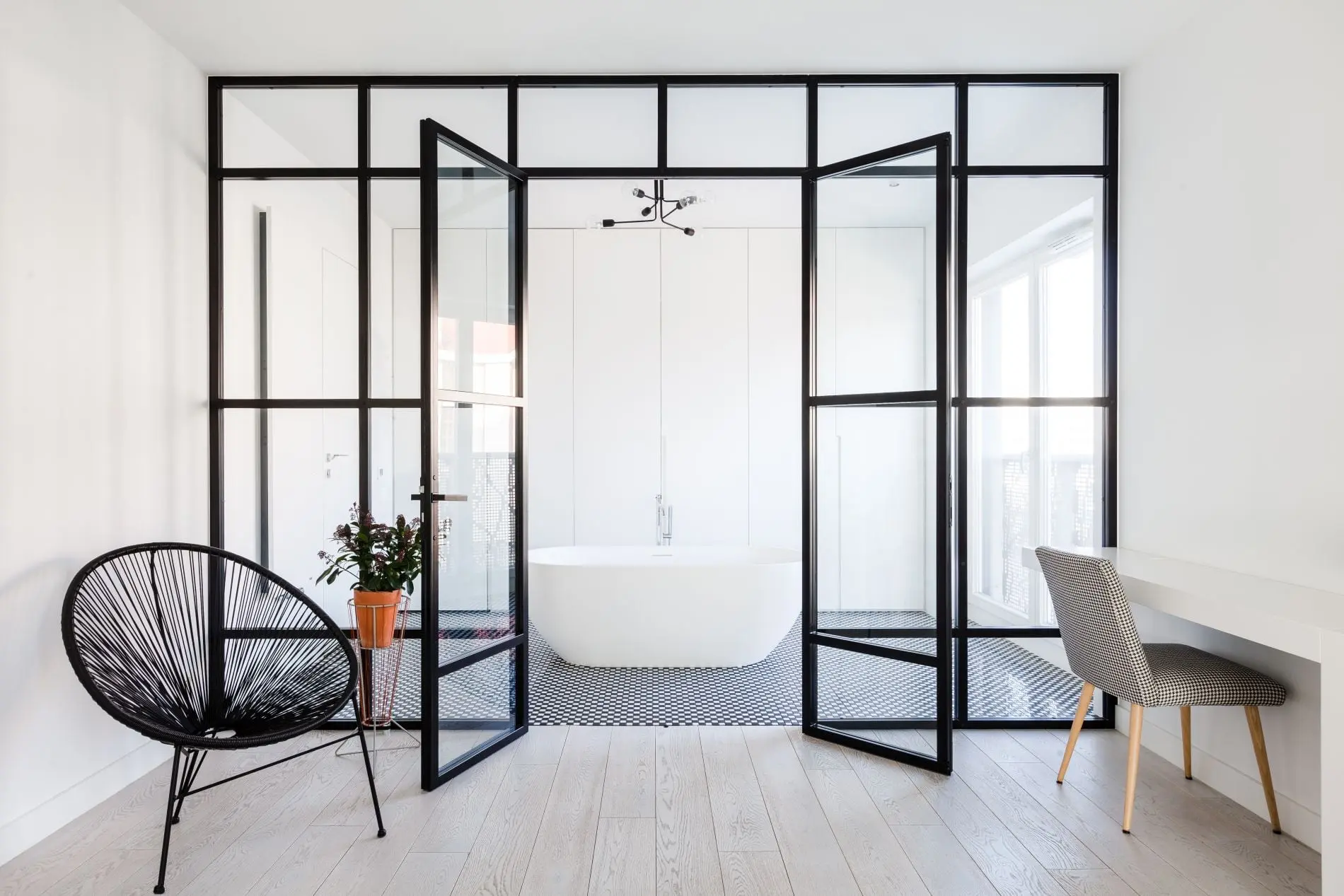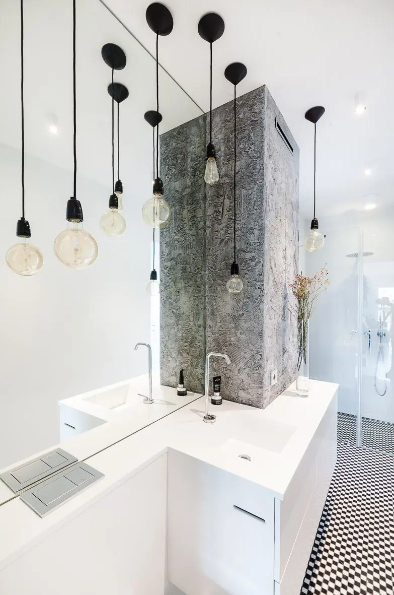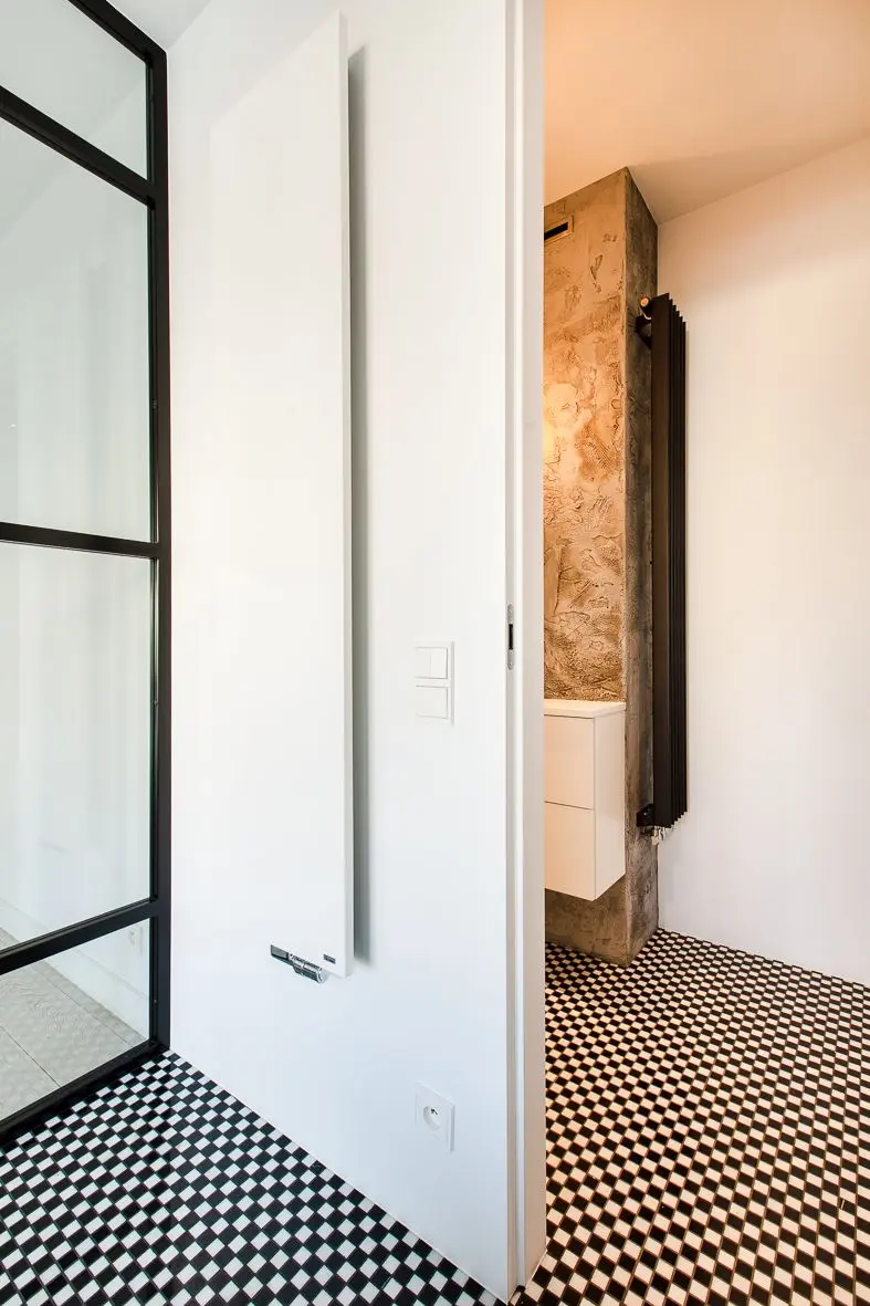 Projekt miał być przede wszystkim spójny i bezpretensjonalny. Apartament jest dla właścicieli miejscem wypoczynku, pracy oraz spotkań w większym gronie. Część dzienną tworzy dyskretny aneks kuchenny, duży jadalniany stół oraz strefa wypoczynkowa wzbogacona o… huśtawkę. Pod jedną ze ścian umieszczono blat roboczy – idealny do pracy zdalnej. Ta część apartamentu została wzbogacona o pokój kąpielowy z wolnostojącą wanną, umieszczony za oszklonymi drzwiami z wyraźnie zarysowaną, czarną kratownicą. Z wanny można oglądać filmy wyświetlane z rzutnika na ścianie nad biurkami. Łazienka jest spójna z całą aranżacją. Króluje w niej beton oraz duet czerni i bieli. Tu również występują industrialne dodatki w postaci oświetlenia nad umywalką oraz stylowego czarnego grzejnika VASCO, który idealnie wpisuje się w tę kompozycję.