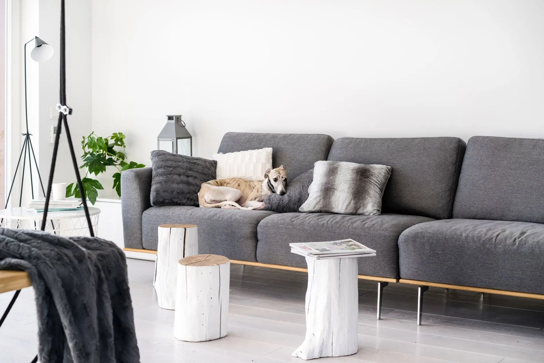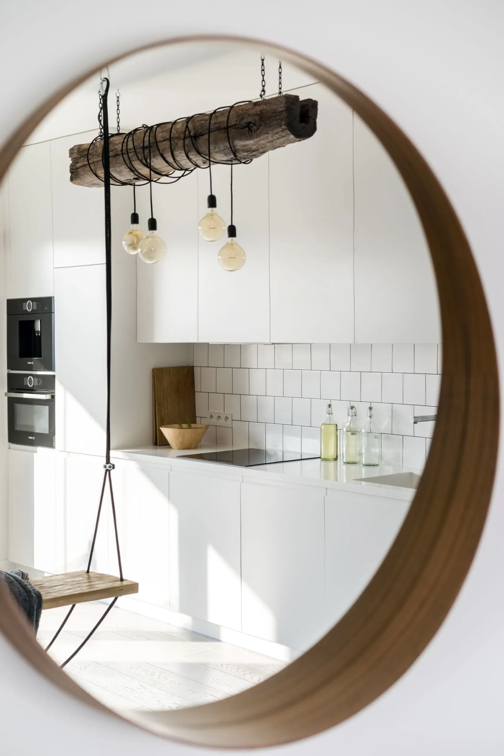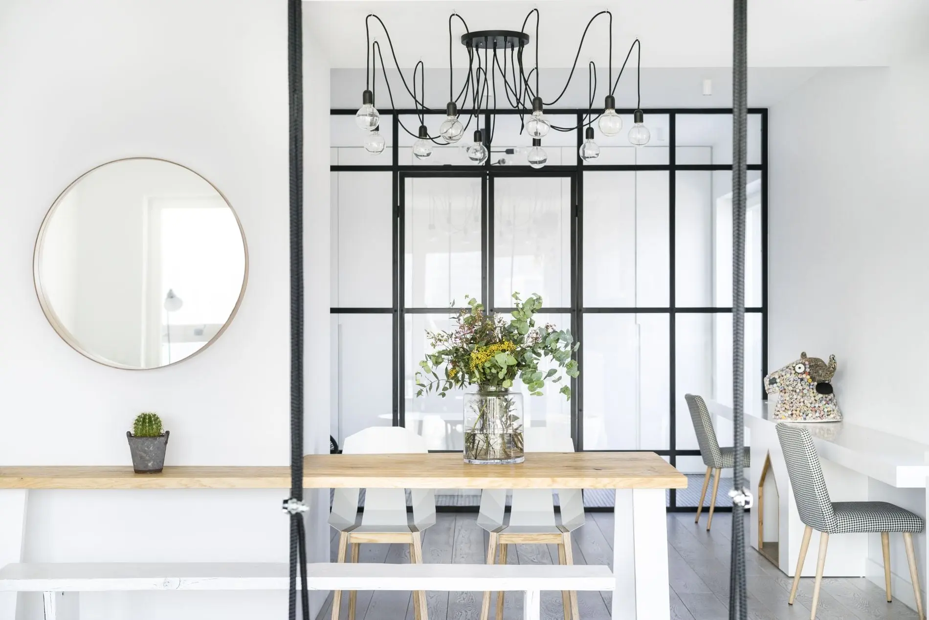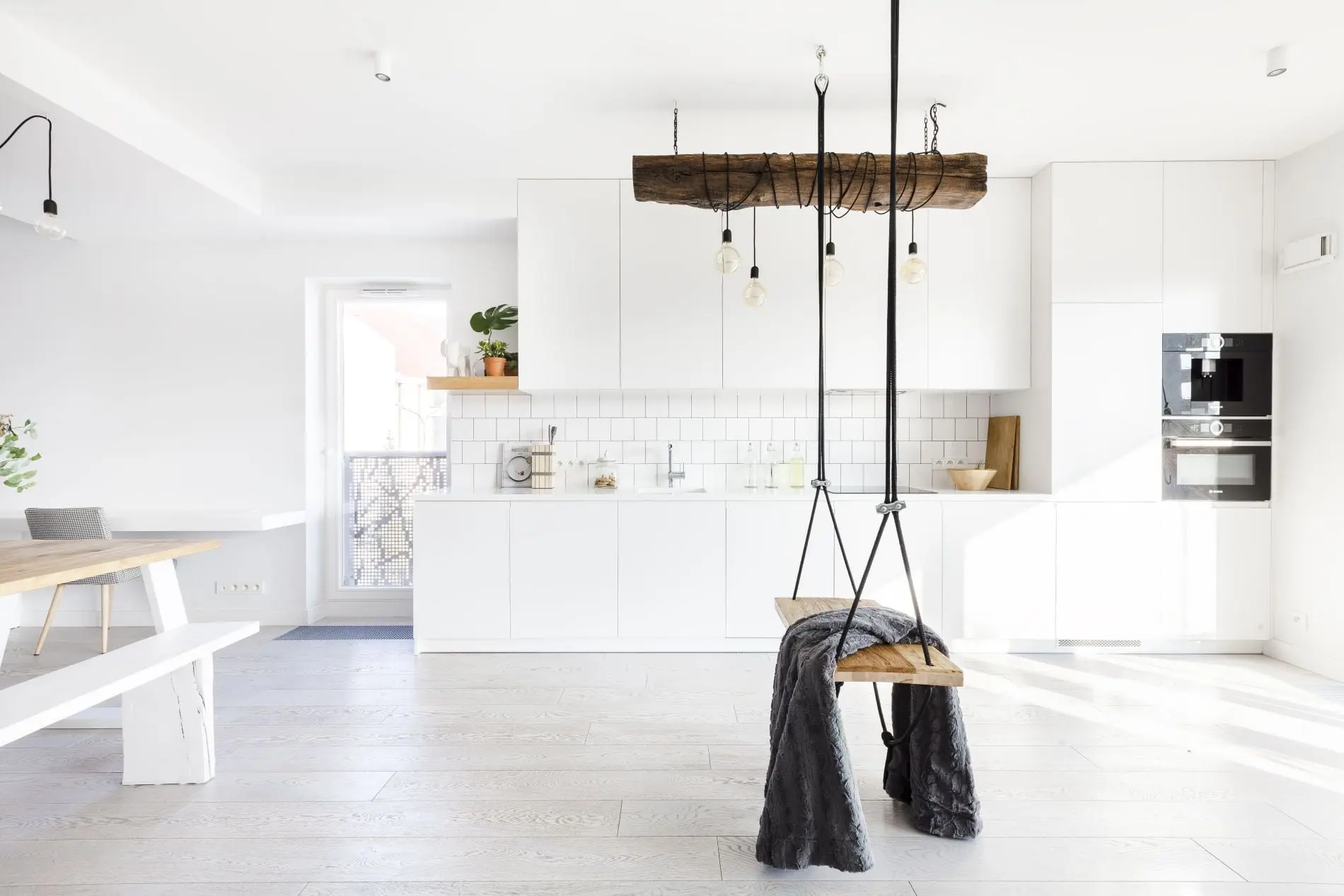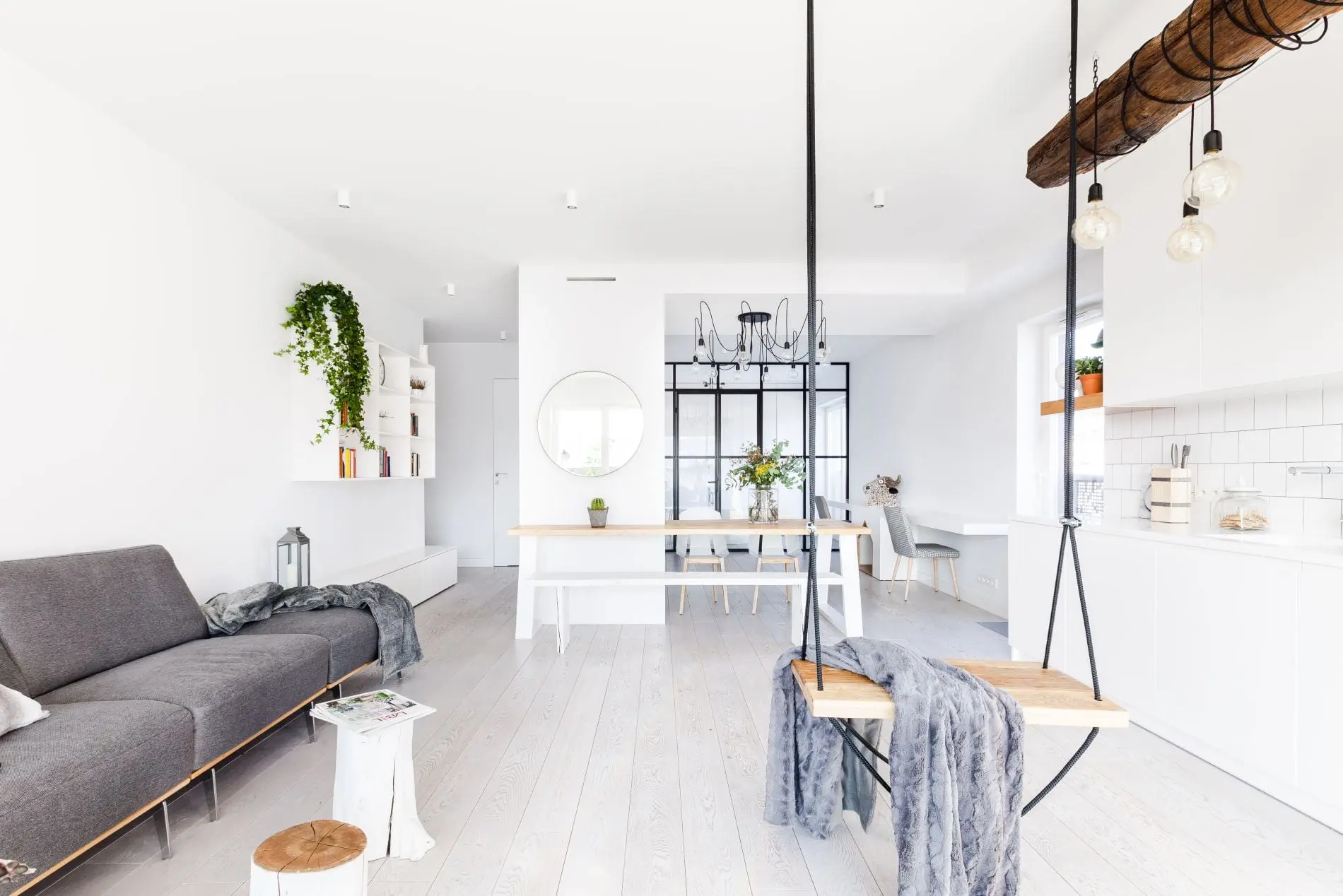 Niebanalny, swobody charakter apartament zawdzięcza starannie dobranym detalom. W strefie dziennej zamiast klasycznego stolika kawowego zdecydowano się na stoliki z pni drzew. Ozdobą tej części apartamentu jest także dekoracja wykonana z podwieszanej na łańcuchach belki i owiniętych wokół żarówek. Między stanowiskami do pracy w domu umieszczono miły akcent w postaci drewnianej skrytki dla charta właścicieli. Ta wyjątkowa przestrzeń sprzyja twórczym projektom. Co jakiś czas zmienia się w plan filmowy bądź studio fotograficzne.