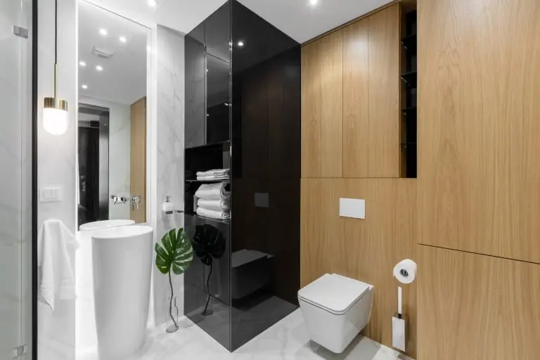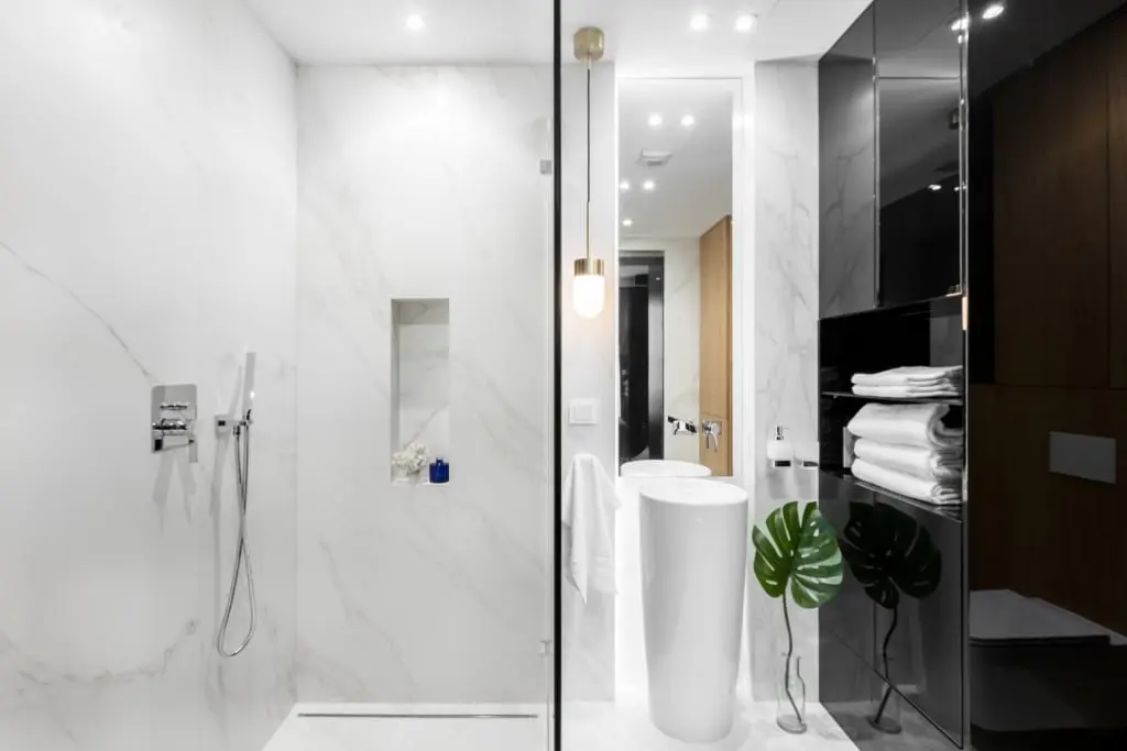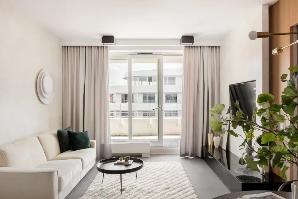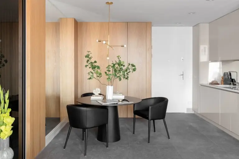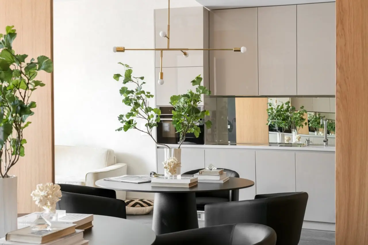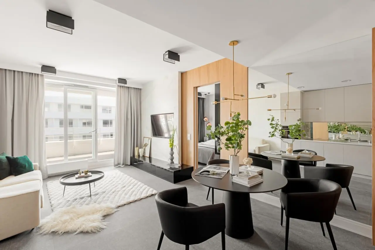 Przewaga jasnych kolorów, umiarkowany minimalizm, prostota, duże lustro i wysoko – połyskowe meble – te wszystkie elementy mają wpływ na optyczne powiększenie przestrzeni. Dodanie do tej harmonijnej kompozycji mocnych czarnych krzeseł z okrągłym stolikiem, doskonale sprawdzającym się przy mniejszym metrażu, czyni to wnętrze nowoczesnym apartamentem nieco zahaczającym o skandynawskie klimaty.