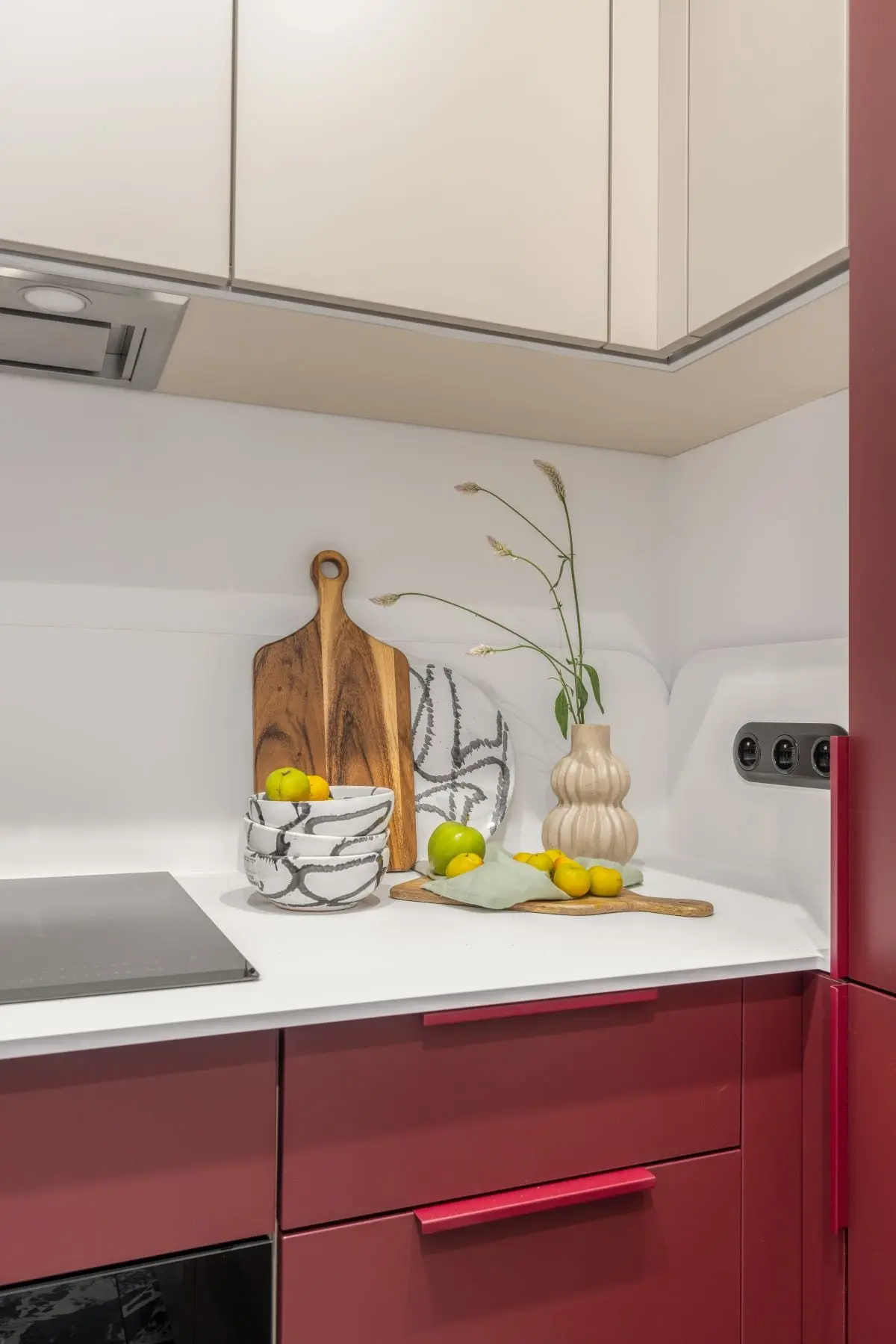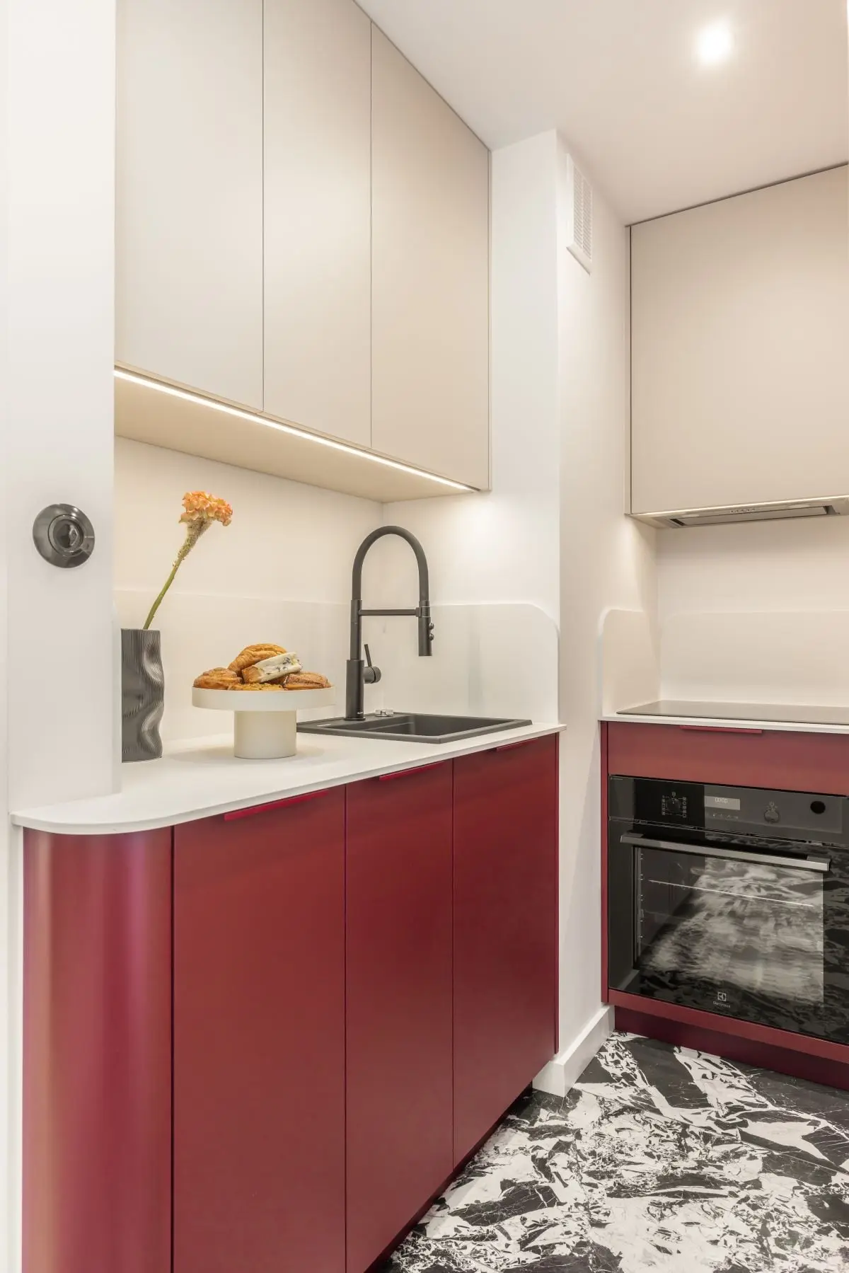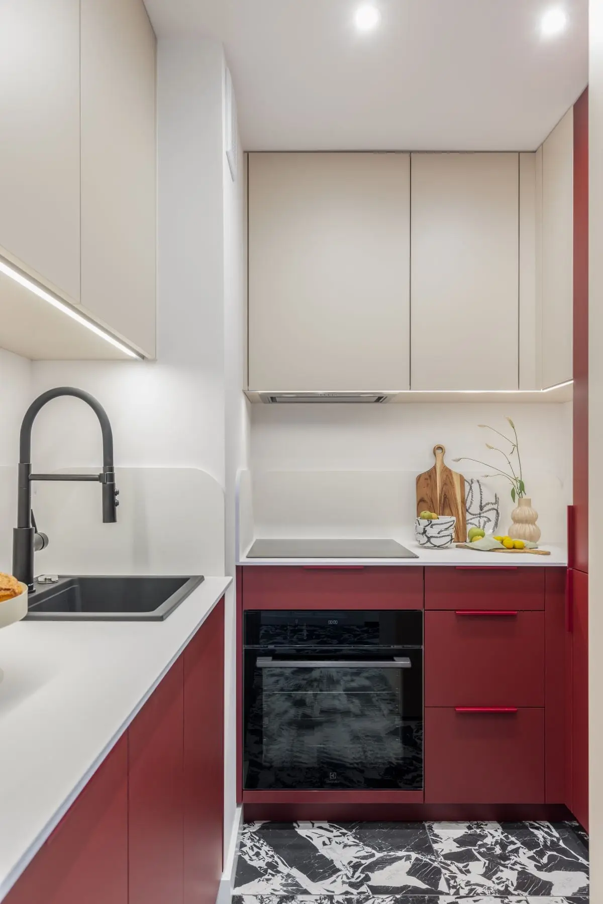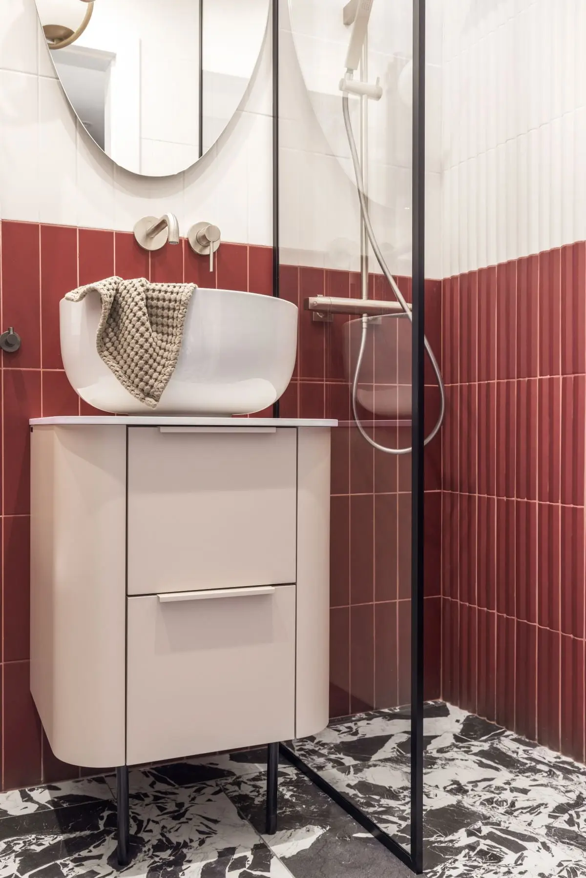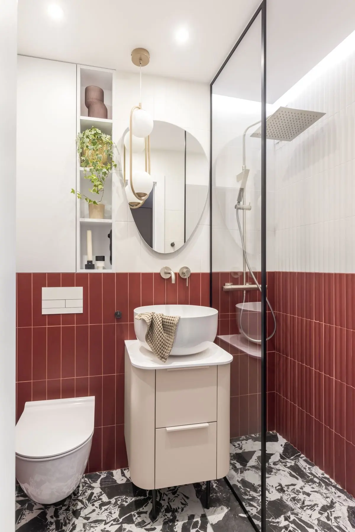 W niewielkiej łazience króluje kolor i ciekawe zestawienie płytek podłogowych producenta 41zero42 z bordowymi cegiełkami. Dla zachowania przestronności, architektki zdecydowały się na instalację strefy prysznicowej z odpływem liniowym.