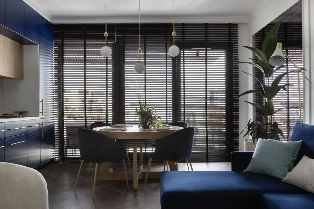 Ze względu na zapewnienie właścicielom komfortu, mimo niewielkiej przestrzeni, powstała w pełni funkcjonalna zabudowa kuchenna z pełnowymiarową lodówką, chłodziarką na wino oraz miejscem do przechowywania niezbędnych akcesoriów i naczyń. Prosta forma zabudowy kuchennej pozwoliła wygospodarować miejsce na wygodny, okrągły stół jadalniany z czterema krzesłami