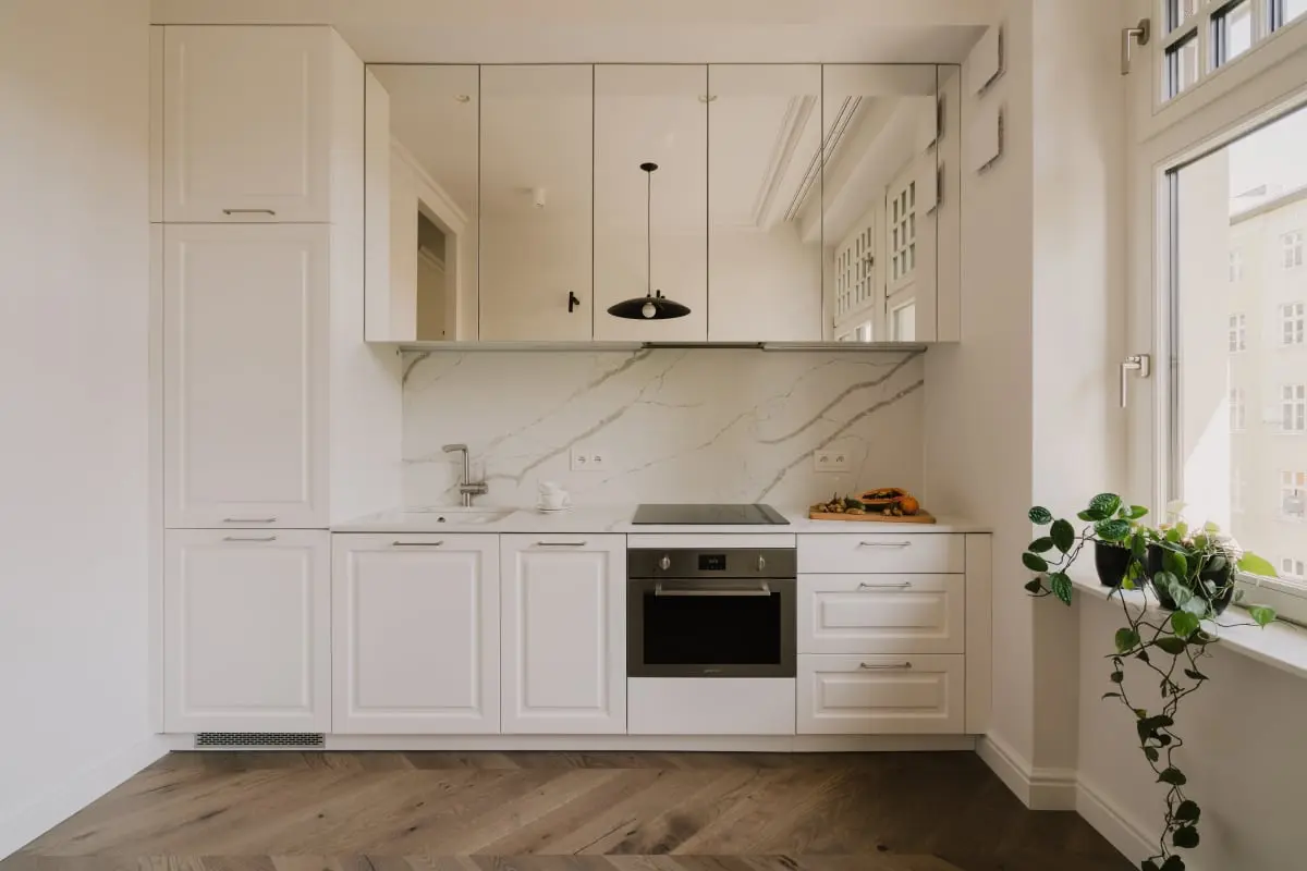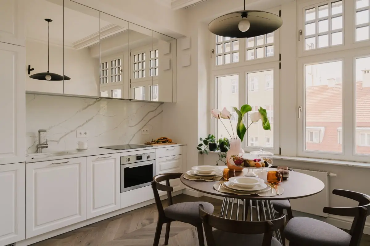 Najważniejszą rolę w mieszkaniu odgrywają wysokie okna, w których zachowano historyczny design. Ich oryginalna forma oraz wpadające przez nie światło stanowią główny element dekoracyjny, którego przedłużeniem są lustra umieszczone na górnych szafkach w kuchni. Taka kompozycja znacząco wpływa na przestrzenną optykę połączonych stref funkcjonalnych. Klimat starego budynku podbija drewniana jodełka francuska na podłodze, elementy z marmuru oraz sztukaterie ścienne i meblowe, a także, utrzymane w klasycznych formach z I połowy XX wieku, tapicerowane krzesła i kanapa. Współczesne akcenty stanowią z kolei designerskie oprawy oświetleniowe i abstrakcyjna grafika ścienna.