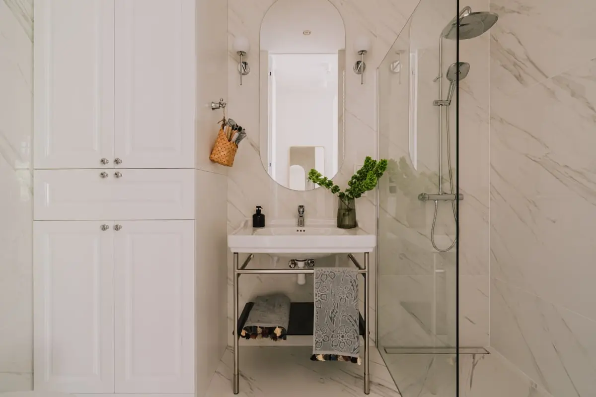 Łazienka mieszkania odzwierciedla klimat całego projektu. Jest klasyczna i utrzymana w jasnej kolorystyce. Ściany i podłogi pokrywają płyty wielkoformatowe o teksturze marmuru, które nadają przestrzeni monolitycznego wyglądu. Styl kamieniczny podkreśla chromowany stelaż na umywalkę, a także frezowane fronty pojemnej szafy. Całość uzupełniają starannie dobrane detale: owalne lustro, kinkiety oraz wieszak oraz uchwyty meblowe.