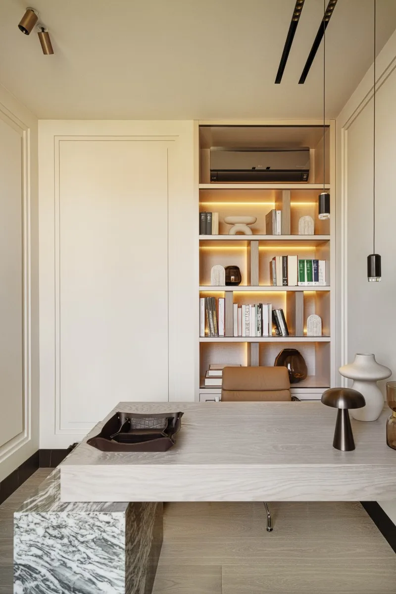 W gabinecie zwraca uwagę przede wszystkim kamienna podstawa biurka, w której zagospodarowano praktyczne szuflady. Masywna bryła stołu biurowego, z którą kontrastują minimalistyczne lampy marki Vibia, jest wyeksponowana na tle ścian subtelnie ozdobionych panelami z karton-gipsu, które tworzą trójwymiarowy efekt.