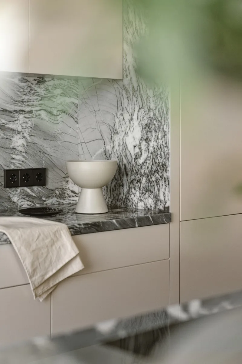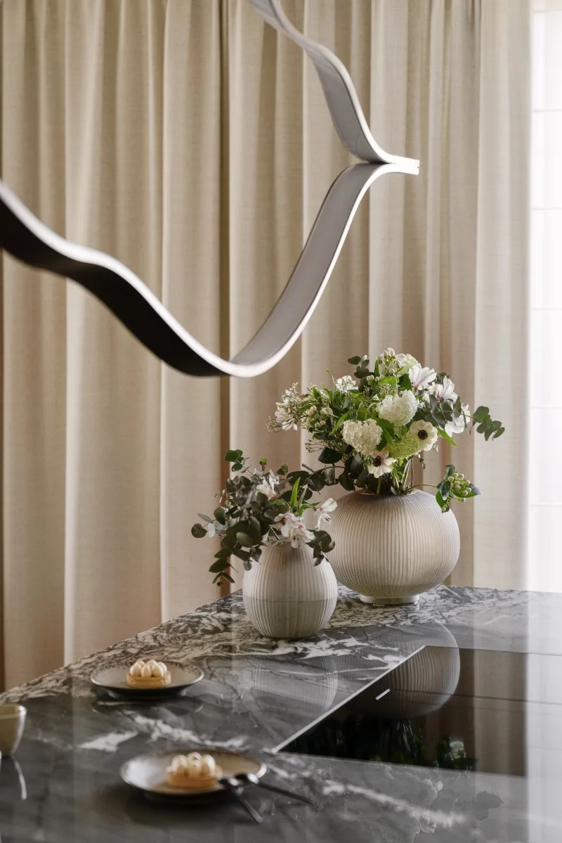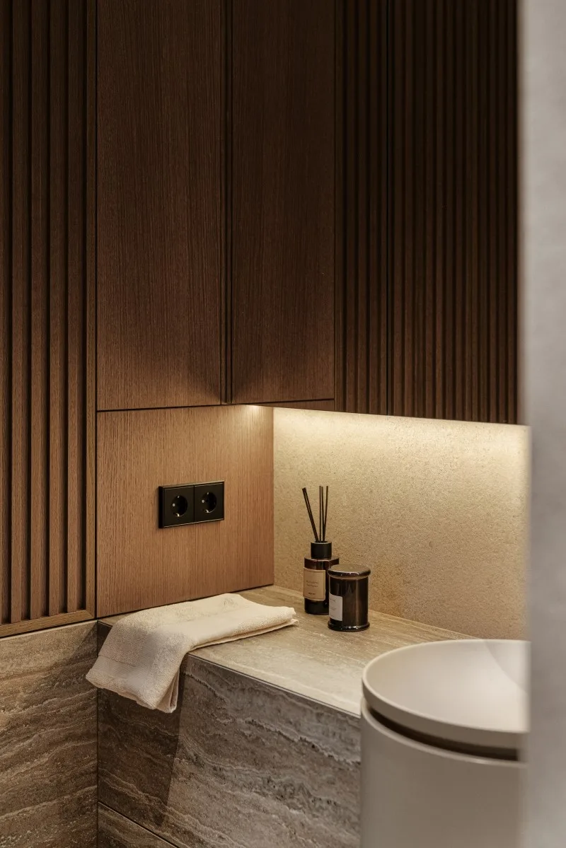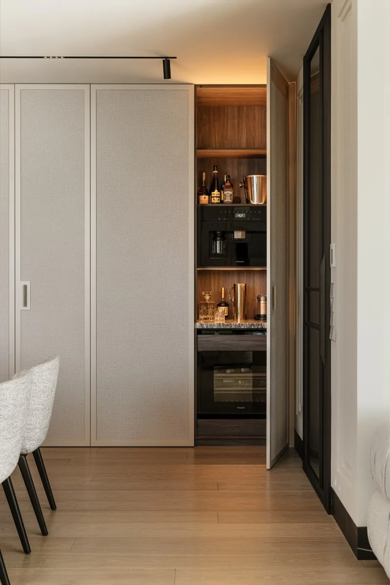 Projekt tego wnętrza to fuzja ponadczasowych materiałów, takich jak chociażby kamień czy dąb na podłodze z nowoczesnymi rozwiązaniami, które nie tylko uatrakcyjniają przestrzeń, ale też realnie wpływają na komfort. Jednym z takich elementów jest barek kawowy ukryty w jasnej zabudowie. Oprócz ekspresu do kawy i wszystkiego, co niezbędne do urządzenia ceremonii parzenia kawy czy herbaty, kawiarniana szafka skrywa również chłodziarkę na wino. Dodatkowy efekt wizualny dają podświetlenia podkreślające luksusowy charakter wnętrza.