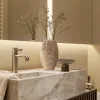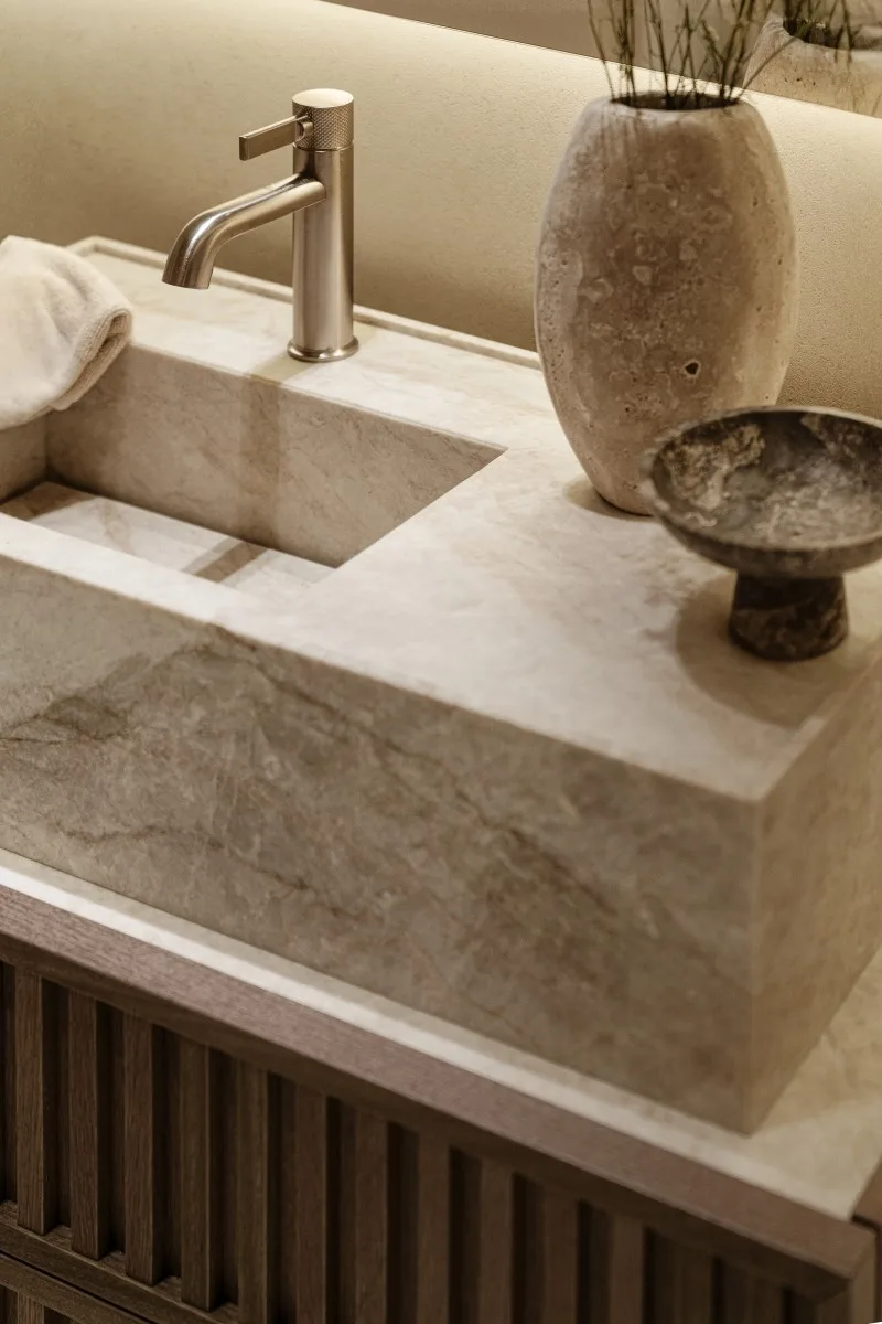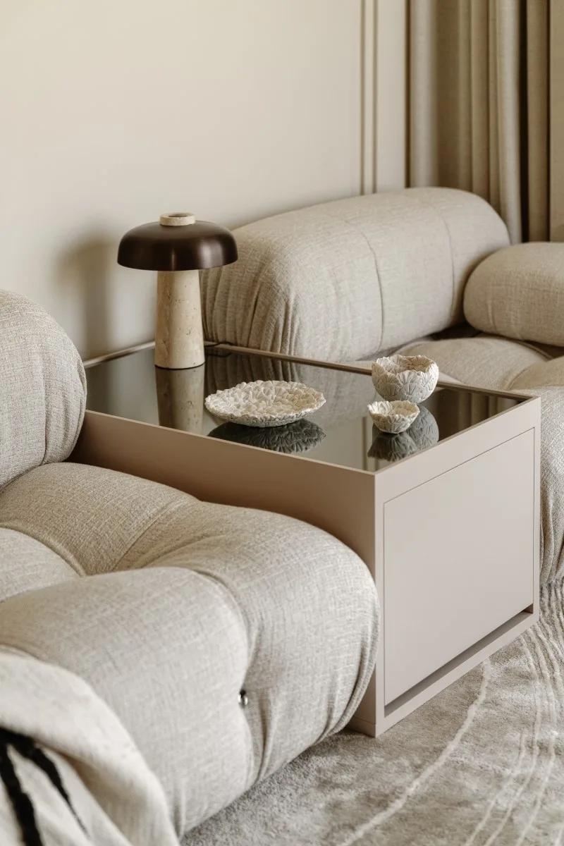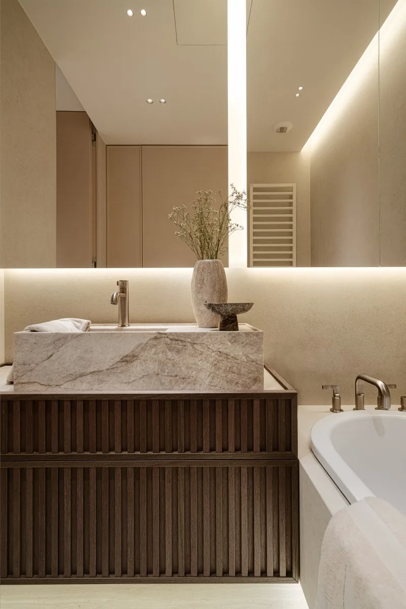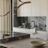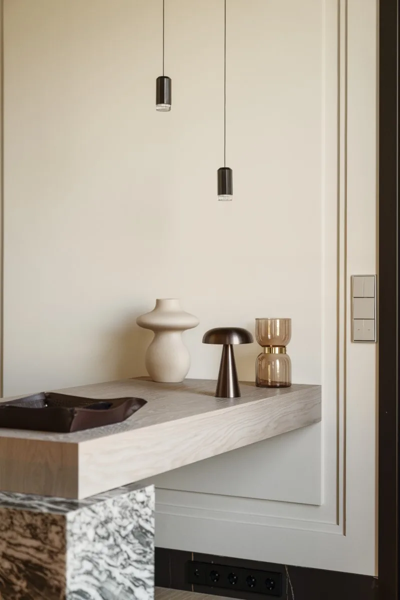 Projekt tego wnętrza to fuzja ponadczasowych materiałów, takich jak chociażby kamień czy dąb na podłodze z nowoczesnymi rozwiązaniami, które nie tylko uatrakcyjniają przestrzeń, ale też realnie wpływają na komfort. Jednym z takich elementów jest barek kawowy ukryty w jasnej zabudowie. Oprócz ekspresu do kawy i wszystkiego, co niezbędne do urządzenia ceremonii parzenia kawy czy herbaty, kawiarniana szafka skrywa również chłodziarkę na wino. Dodatkowy efekt wizualny dają podświetlenia podkreślające luksusowy charakter wnętrza.