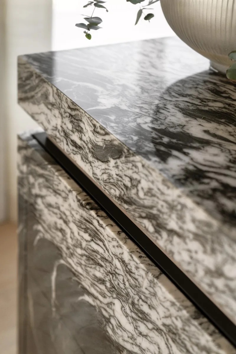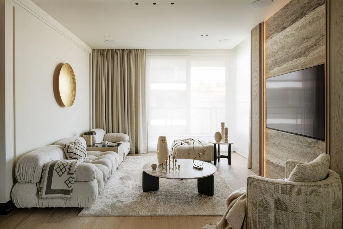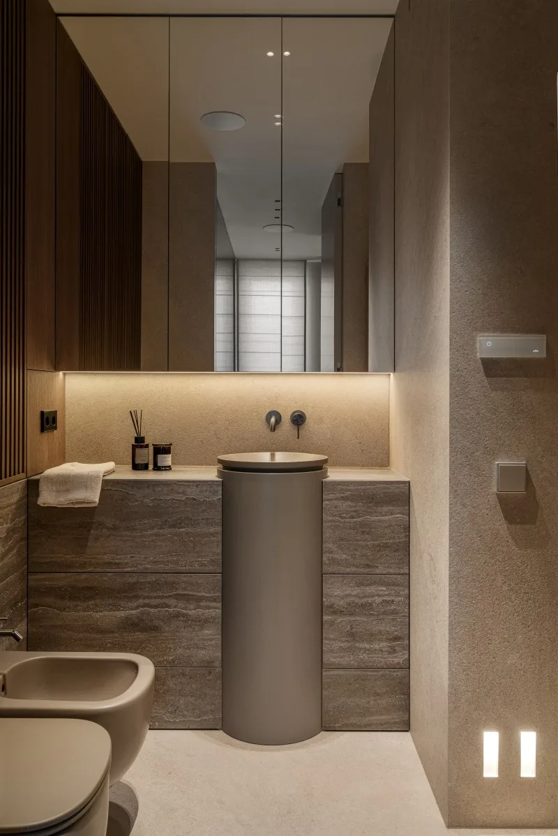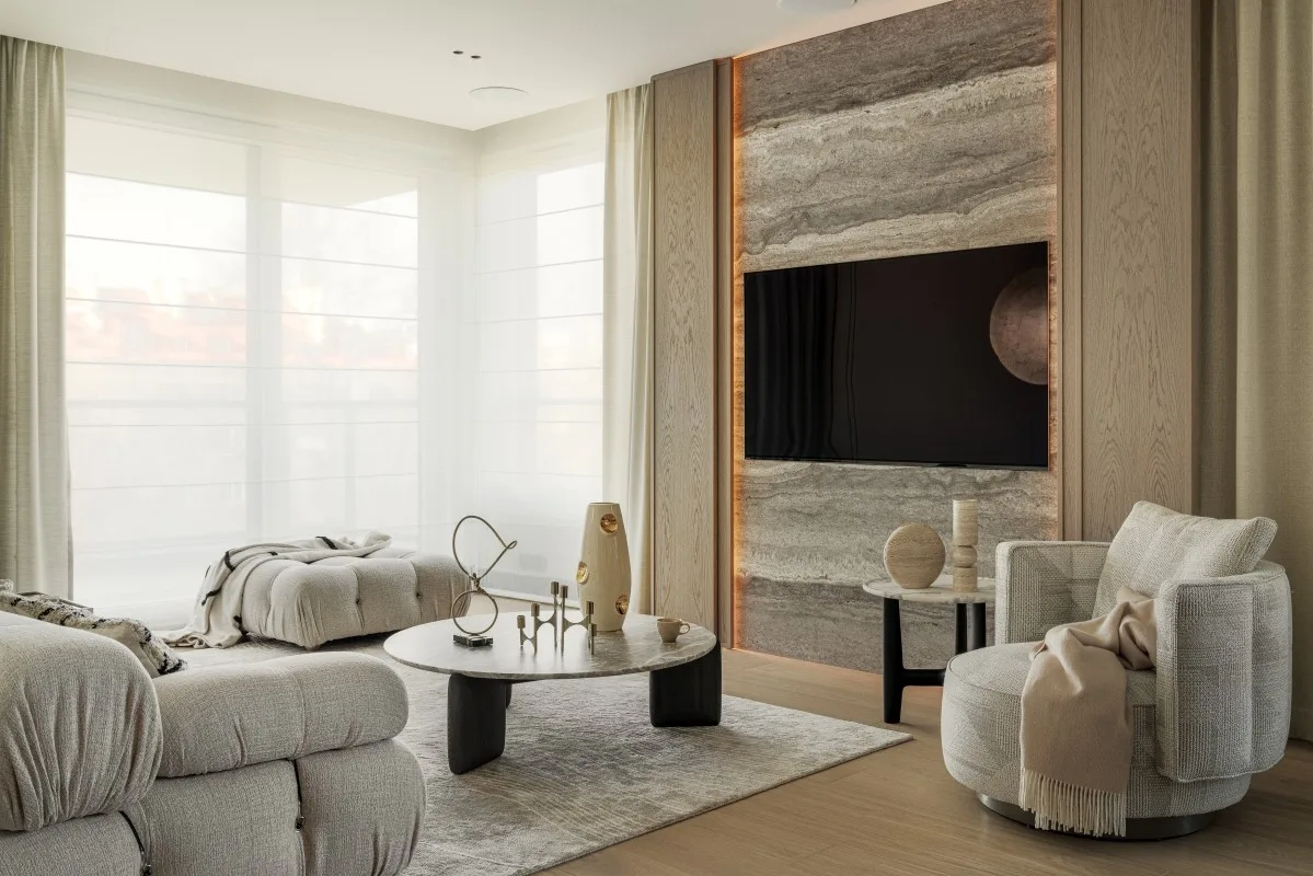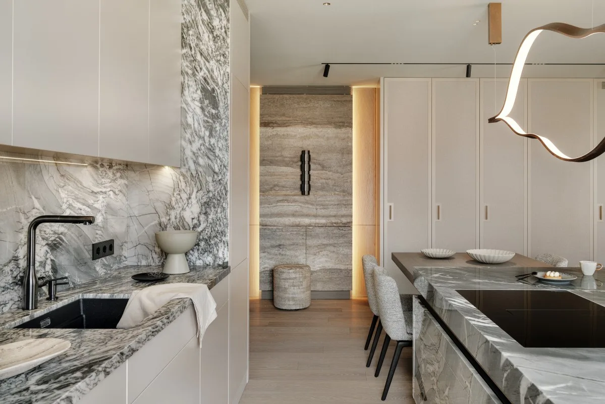 Lustrzane ściany z ukrytymi drzwiami dopełnia szary trawertyn na ścianach: w przedpokoju ukrywa klimatyzację, natomiast w salonie tworzy efektową ścianę telewizyjną. Innym kamieniem wykorzystanym w aranżacji jest kwarcyt na wyspie, blacie kuchennym oraz ścianie nad nim. Miękkości wnętrzu nadają wełniane zasłony oraz tkaninowa tapeta na frontach dużej zabudowy w korytarzu.