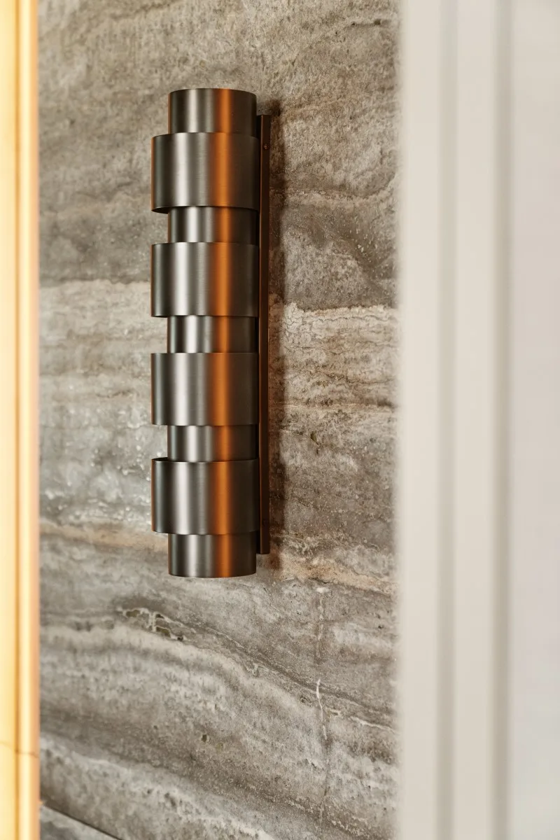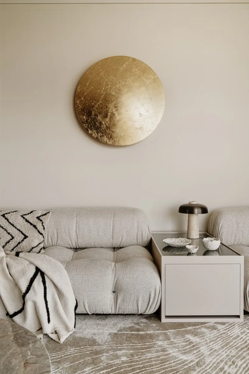 Ważnym elementem projektu oświetlenia są również lampy dekoracyjne, przede wszystkim rzeźbiarska lampa wisząca nad wyspą marki Henge oraz złoty dysk kinkietu zadający szyku ścianie nad sofą w salonie. Nie są to modele, które dają duże światła… ich rolą jest dopełnienie aranżacji oraz tworzenie wyjątkowego klimatu po zmroku.