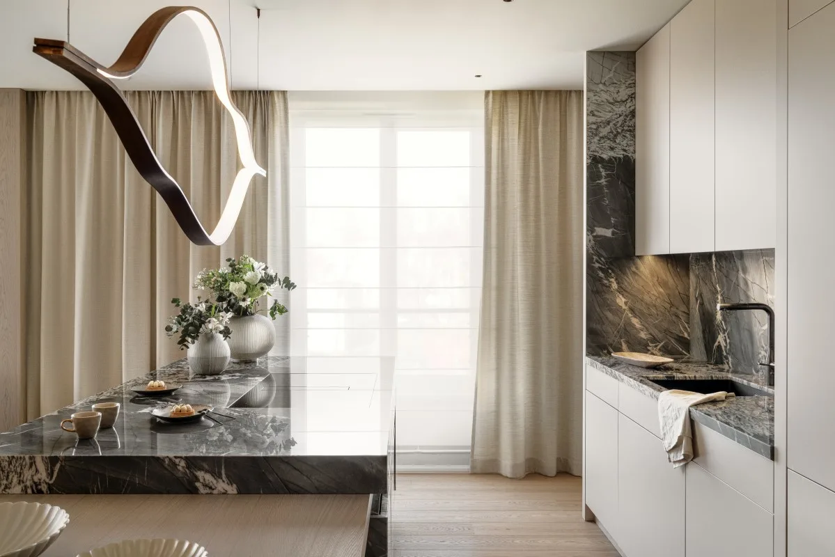 Strefa dzienna składa się z korytarza, salonu oraz otwartej kuchni z okazałą, kamienną wyspą połączoną z fornirowanym stołem pełniącym rolę jadani. Lekkości majestatycznej wyspie nadaje lustrzany, podświetlany cokół.