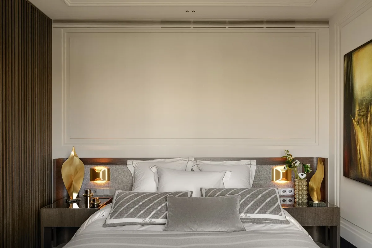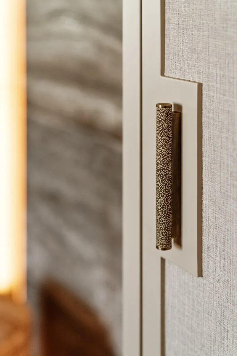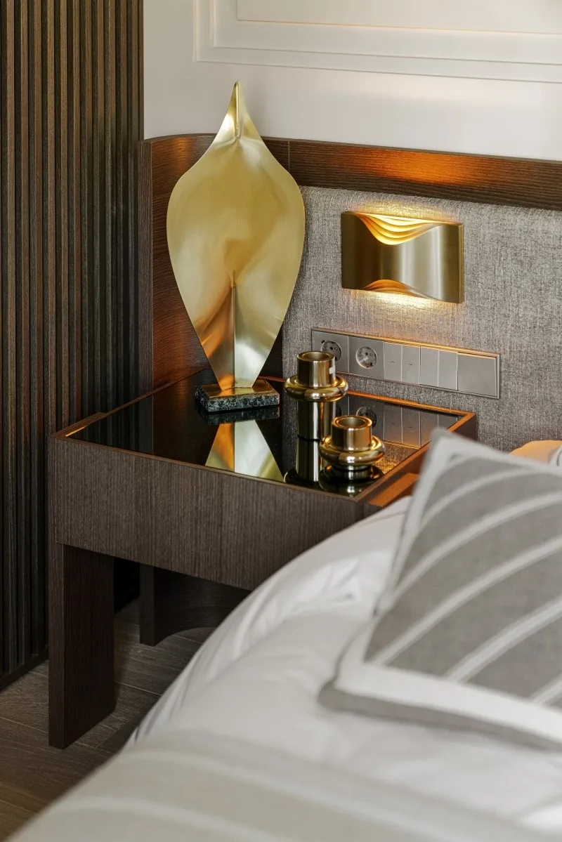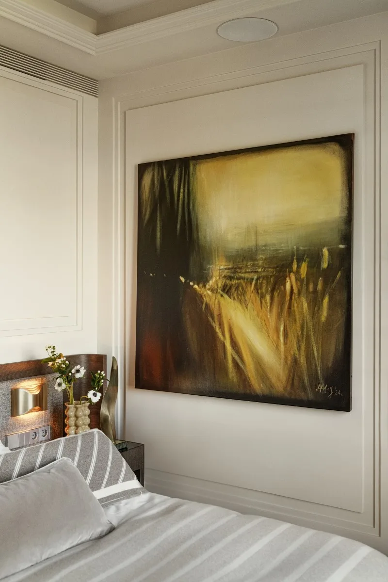 Gościnnej sypialni romantyczny charakter nadaje parawan umieszczony za wezgłowiem łóżka – to tapeta francuskiej marki Anabo, oprawiona w delikatne, metalowe ramki. Z kolei sypialnię pana domu zdobi płótno autorstwa Agnieszki Hoji – Jurewicz. Od lustrzanej garderoby pomieszczenie oddziela ażurowy panel, który poprzez ryflowanie i fornir o szarym odcieniu koresponduje z szafką w łazience, wykonaną na zamówienie pod kamienną umywalkę. To przykład projektu, w którym dbałość o detal i konsekwencja stylistyczna budują wyjątkowy charakter wnętrza.