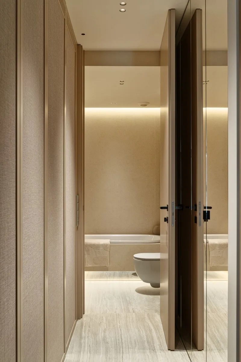 Nieco zaskakująco, bo tuż obok zabudowy kuchennej rozpoczyna się ciąg pomieszczeń ukrytych w amfiladzie wzdłuż linii okien. Znajdziemy tu gabinet, który dzieli strefę dzienną i prywatną, sypialnię, garderobę oraz łazienkę główną. Ponadto inwestorowi zależało na tym, aby w apartamencie znajdowała się sypialnia gościnna oraz dodatkowa łazienka z oddzielną pralnią.