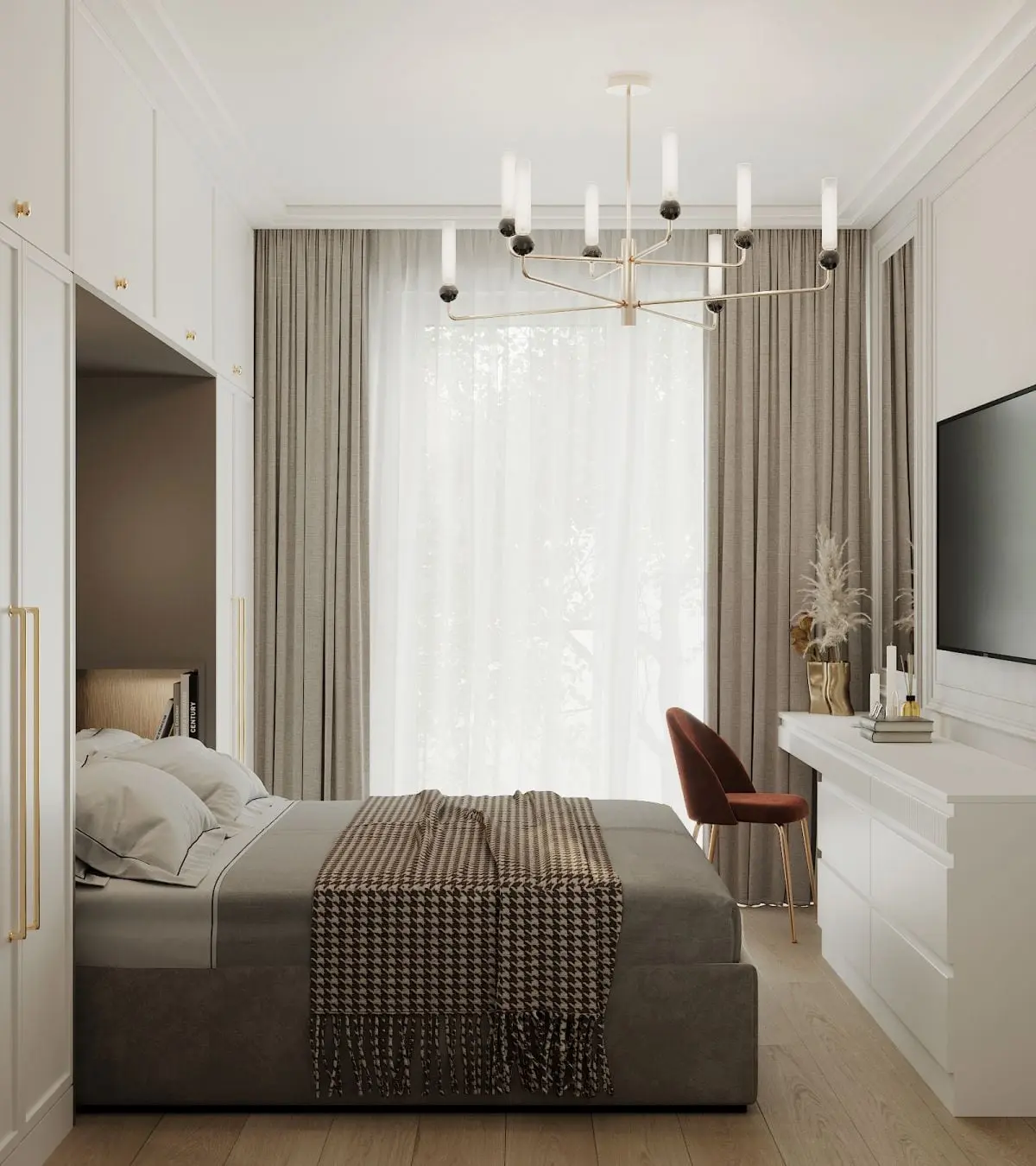 Inwestorom zależało na tym, aby w sypialni było dużo miejsca do przechowywania. Architektki zaproponowały więc zabudowę na całej ścianie, okalającą robione na zamówienie łóżko z tapicerowanym wezgłowiem według ich projektu. Naprzeciw niego znajdują się wygodne szuflady oraz toaletka. Całość jest utrzymana w bieli i brązach z detalami w kolorze złota.