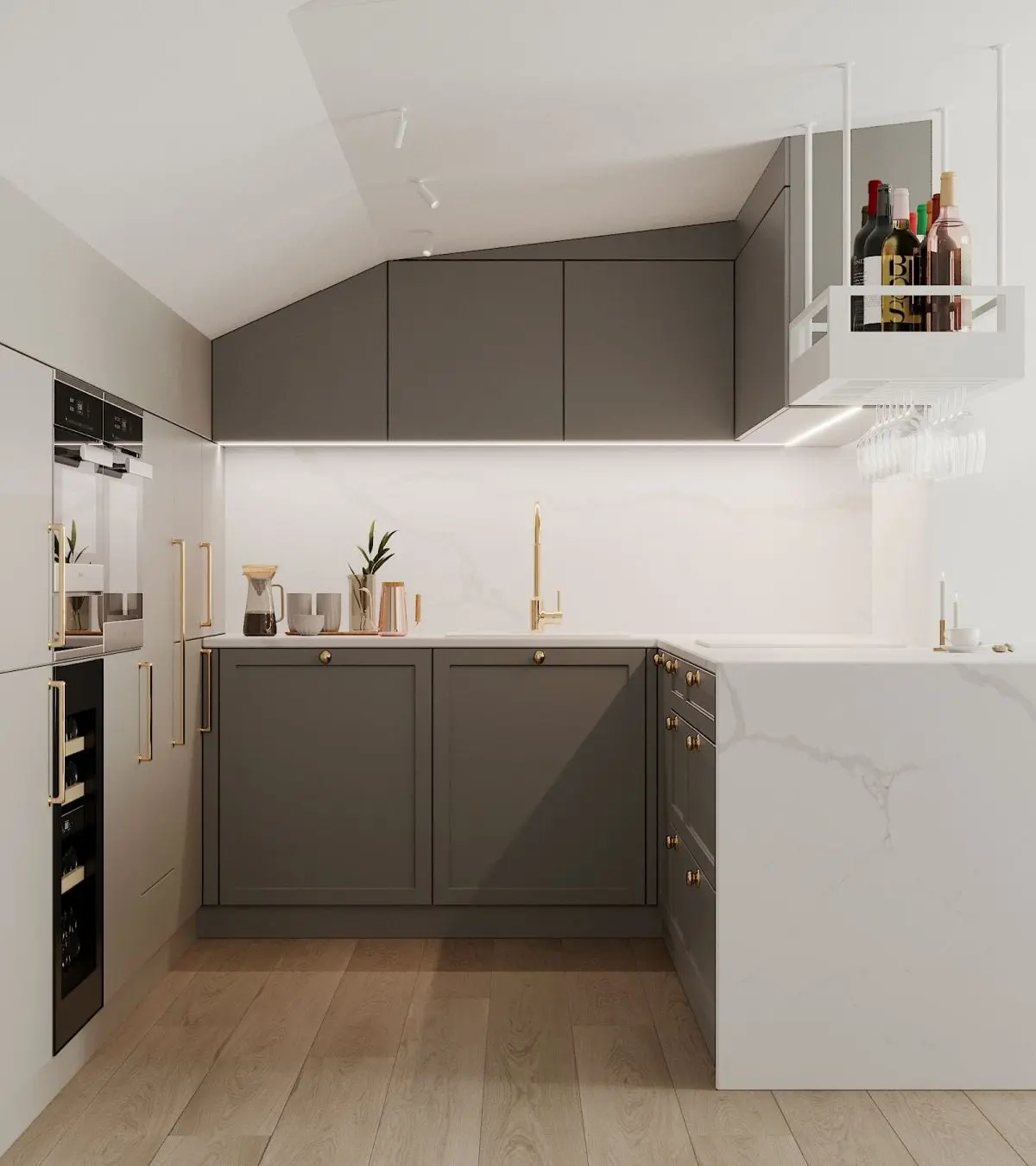 Tuż przy schodach jest umiejscowiona kuchnia z zabudową w kształcie litery U, zapewniającą odpowiednią powierzchnię do przechowywania. Architektki z MIKOŁAJSKAstudio zaprojektowały szafki wiszące nad blatem tak, aby wpasowały się pod skosy – dzięki zastosowaniu blend zabudowa estetycznie łączy się z sufitem. Zestawione ze sobą fronty proste i ramkowe, konglomerat na blacie i ścianie oraz złota bateria i uchwyty meblowe tworzą udany mariaż nowoczesności i klasyki. Właścicielom zależało, aby w kuchni znalazło się miejsce na wypicie porannej kawy czy szybki posiłek – udało się je wygospodarować po drugiej stronie półwyspu, poprzez zamontowanie na nim blatu wystającego poza obręb zabudowy i ustawieniu przy nim hokerów. Kuchnię od salonu oddziela strefa jadalniana z wygodnym stołem z drewnianym blatem na czarnych stalowych nogach, nad którym wisi spektakularna, przyciągająca wzrok lampa marki. Ściany w przyjemnym, popielatym kolorze zostały ozdobione sztukaterią, która wraz z obrazami tworzy uporządkowane tło dla asymetrycznej oprawy oświetleniowej.