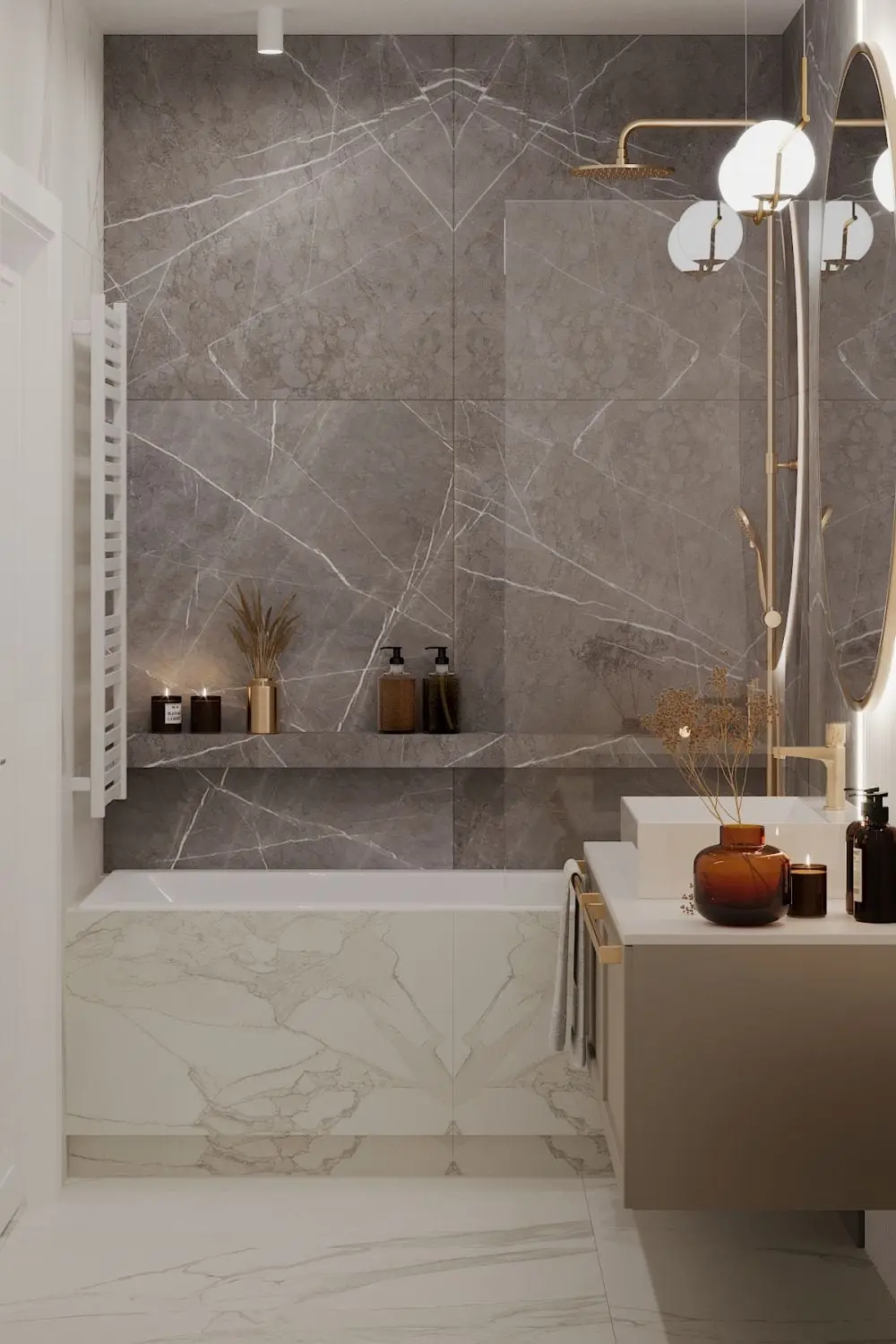 Łazienka znajdująca się na parterze mieszkania jest elegancka, ciepła i bardzo wygodna. Ściana, przy której jest zainstalowana toaleta, oraz fronty szafek nad spłuczką podtynkową, zostały wykończone wodoodpornymi płytami laminowanymi w jasnym, naturalnym odcieniu. Podłogę, obudowę wanny oraz ścianę przy wannie pokrywa gres w dwóch kolorach, z wyraźnym, dekoracyjnym wzorem kamienia. Duże wrażenie robią okrągłe lustro w złotej ramie oraz asymetryczna, dekoracyjna lampa.