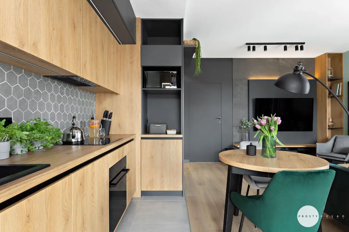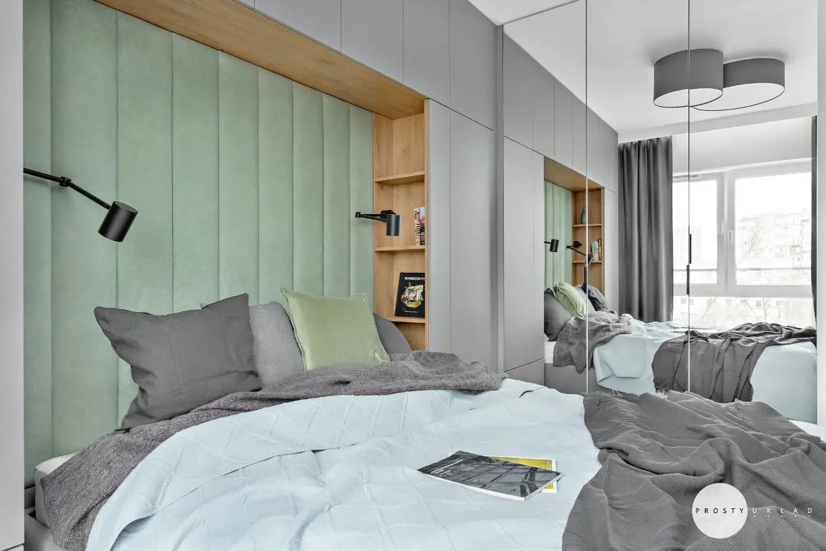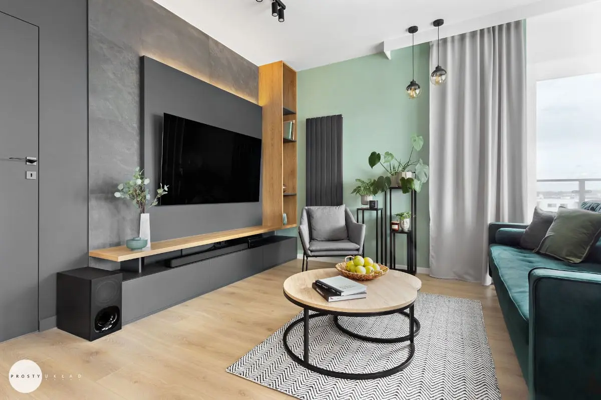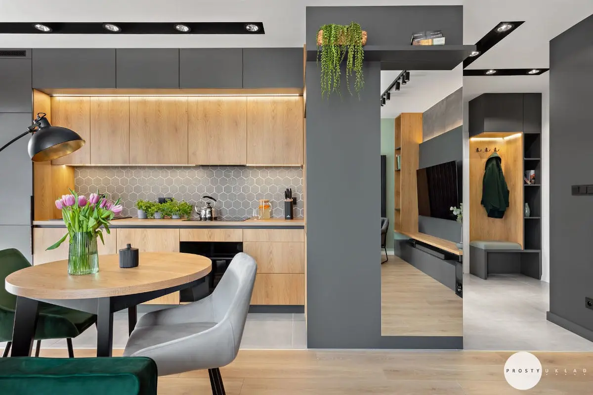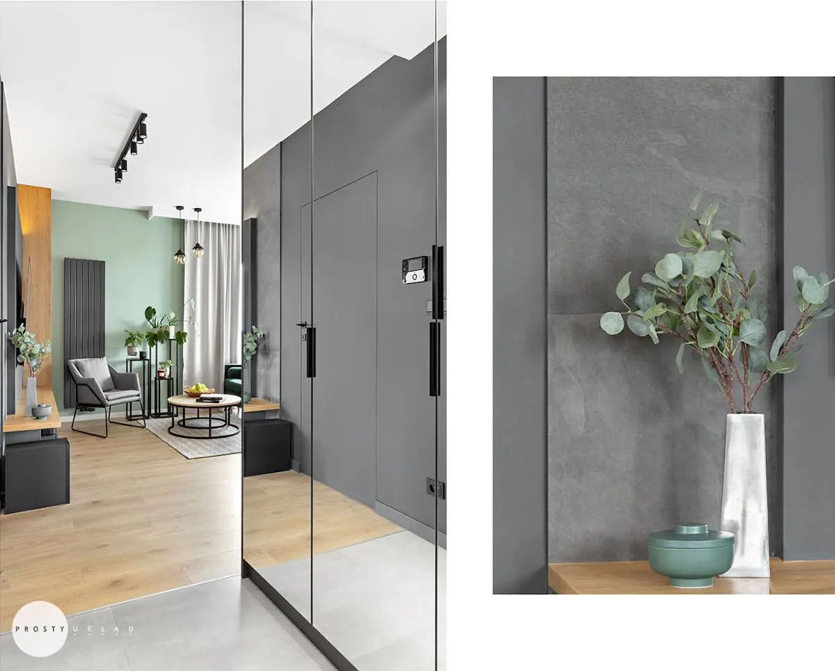 Choć często o tym zapominamy, piękno jest zaklęte w prostocie. Ten projekt autorstwa pracowni Prosty Układ jest na to żywym dowodem. Znajdziemy tu mnóstwo przemyślanych rozwiązań, które nie tylko czynią to 57 – metrowe lokum niezwykle funkcjonalnym, ale też komfortowym i w pełni przystosowanym do potrzeb inwestorów. Młoda para, do której należy mieszkanie, była bardzo świadoma czego oczekuje od swoich czterech kątów. Oprócz dużej ilości miejsca do przechowywania, powiedzieli wyraźne „tak” dla połączenia zieleni z antracytem. Ten piękny duet tak naprawdę zadecydował o charakterze wnętrza i tym samym naczelnie traktowaną prostotę oraz użytkowość włożył w piękne ramy.
