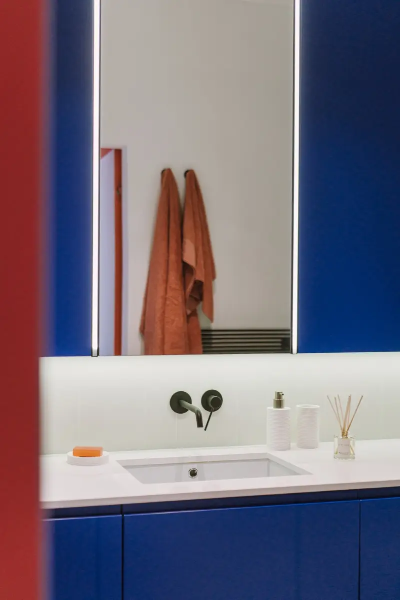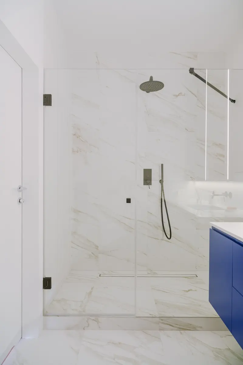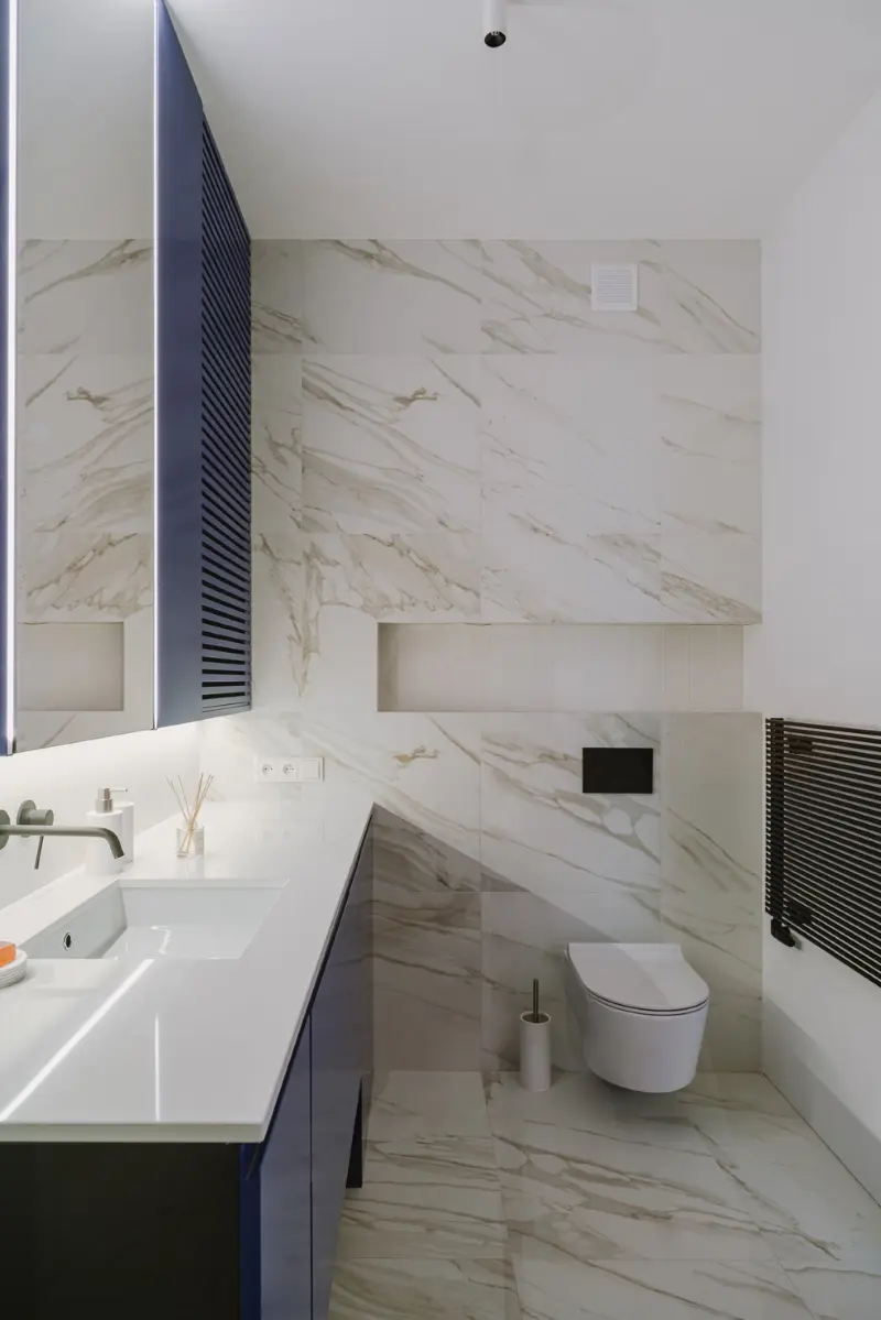 Łazienka mieszkania jest najspokojniejszym kolorystycznie pomieszczeniem. Jednak nie zabrakło w niej motywu barwnego, w postaci kobaltu. Intensywny błękit nawiązuję do pojawiającego się akcentu kobaltu w innych częściach mieszkania, min. do konsoli. Bardzo minimalistyczną aranżację uzupełniają płytki podłogowe imitujące marmur oraz czarna armatura podtynkowa, polskiej marki Hushlab.