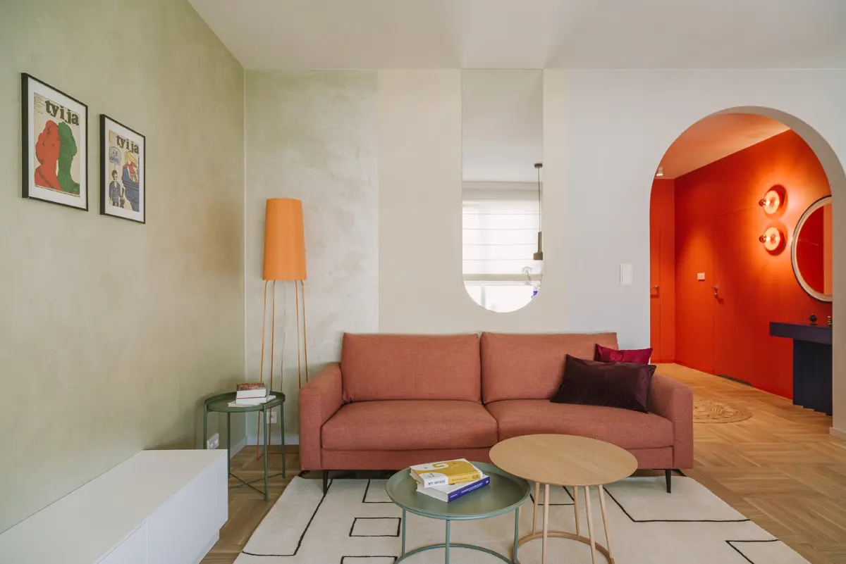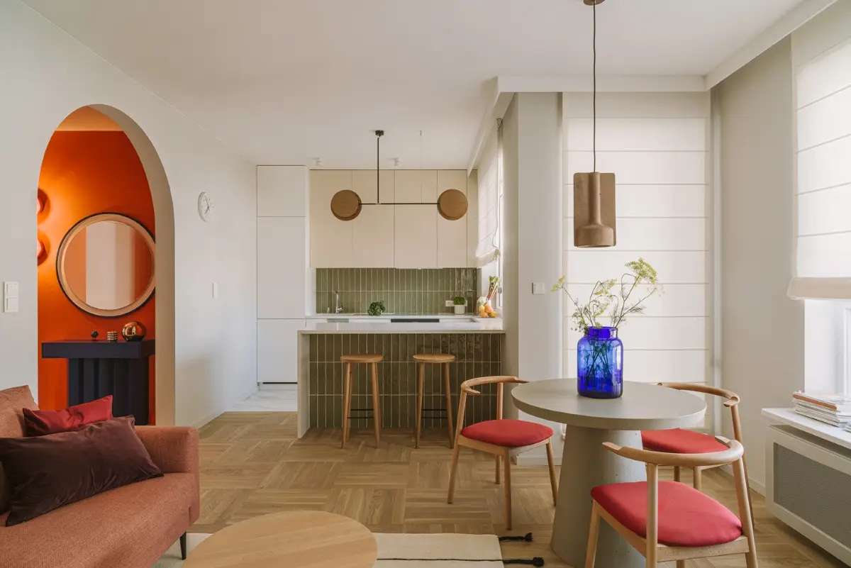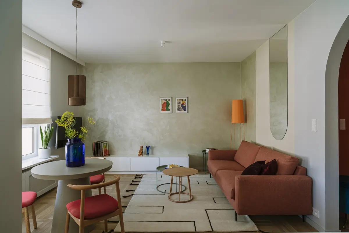 Mieszkanie zaprojektowane przez studio architektoniczne Dziurdzia  projekt, jest odzwierciedleniem współczesnego stylu życia. Dążenie do minimalizmu wynika z potrzeby funkcjonalności oraz ograniczenia ilości posiadanych rzeczy. Główną rolę we wnętrzu gra kolor, który zmienia się w zależności od pomieszczenia: korytarz wypełnia energetyczna pomarańcza, strefę dzienną mięta z akcentem maliny, a w sypialni panują rozbielone, relaksujące tony.  Właśnie dzięki kolorom mieszkanie otrzymało swój wyjątkowy charakter, a wyposażenie jest bardzo przemyślane i poza stroną wizualną, spełnia przede wszystkim funkcje praktyczne. Wszystkie te zabiegi doprowadziły do zamierzonego celu, czyli stworzeniu mieszkania, które jest podporządkowane jego mieszkańcom, a nie odwrotnie.