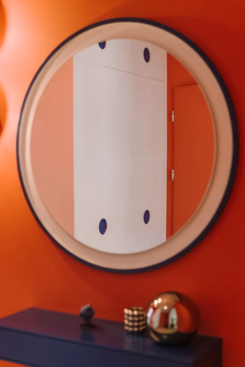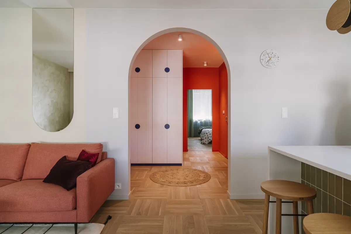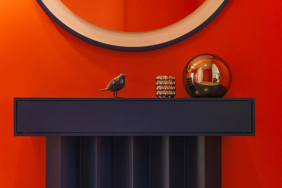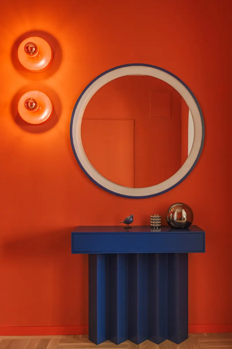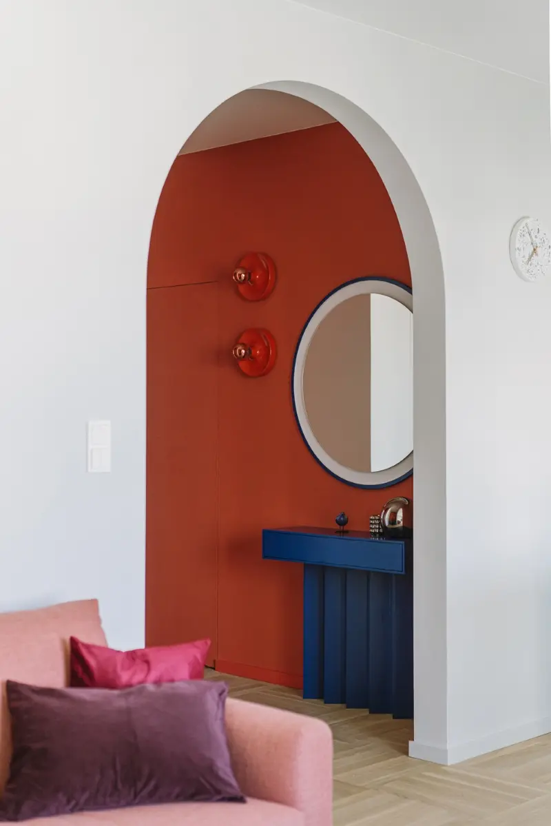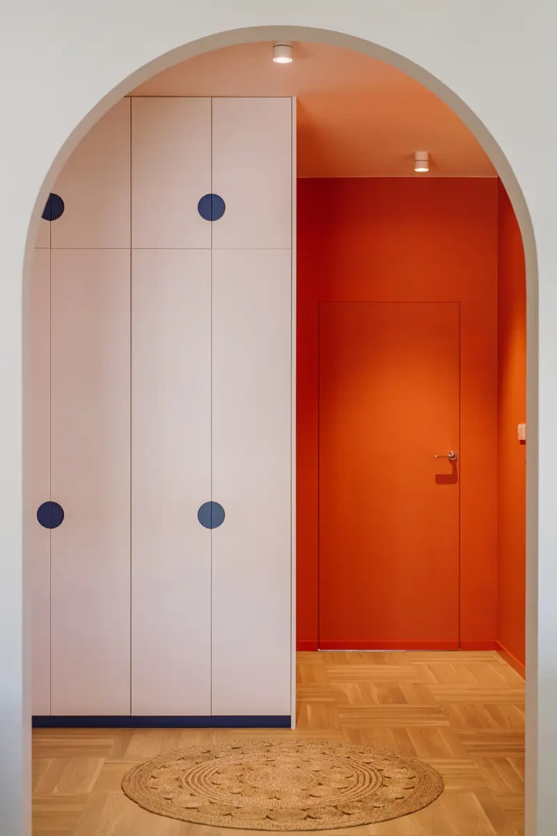 Intensywny pomarańcz wita wchodzących od samego progu, za sprawą ścian, pokrytych tym kolorem. Drzwi wejściowe oraz drzwi sypialni, również zostały pomalowane na pomarańczowo, co spowodowało uzyskanie jednolitej powierzchni barwnej, optycznie powiększającej przedpokój. Zabieg ten został dodatkowo spotęgowany, dzięki  dużemu portalowi w formie łuku, prowadzącego do części dziennej, który dodatkowo doświetla korytarz. Przy wejściu do mieszkania czeka jeszcze jedna niespodzianka – bardzo oryginalna konsola z lustrem, w kolorze kobaltu.