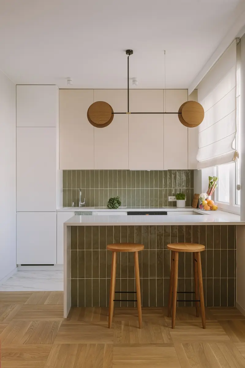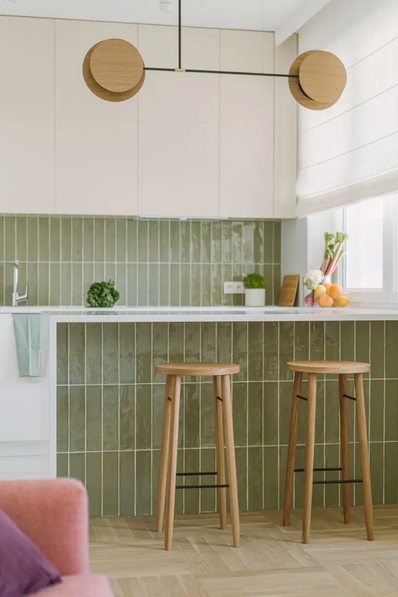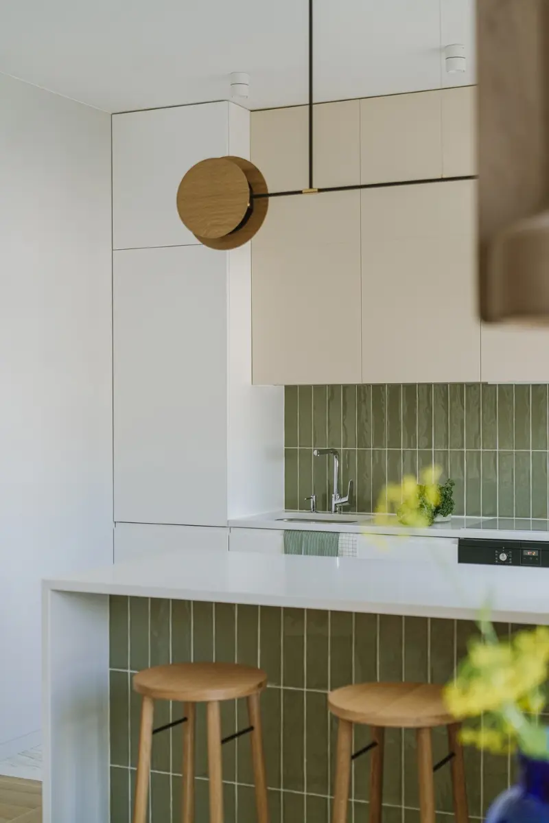 Kuchnia z zielonymi płytkami typu cegiełka, marki Equipe. | Proj. Dziurdzia Projekt, Fot. PION