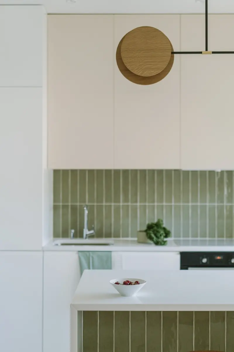 Odcienie zieleni, będące kolorystycznym leitmotywem aranżacji wnętrza, pojawiają się w części aneksu kuchennego, gdzie wykorzystano płytki hiszpańskiej marki Equipe. Cegiełkami w wersji wertykalnej, obłożona jest wyspa kuchenna i ściana nad blatem.