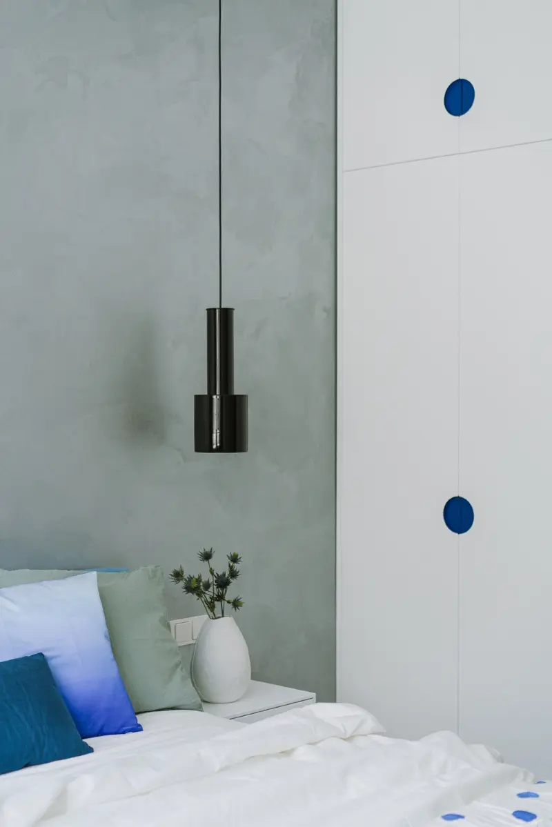 Mięta znalazła się również w sypialni, gdzie została zestawiona z błękitami. Chłodna kolorystyka wprowadza do wnętrza atmosferę relaksu i wyciszenia, tak ważną w miejscu przeznaczonym do odpoczynku. Tradycyjne lampki nocne, zastępują czarne lampy wiszące, umieszczone po obu stronach łóżka.