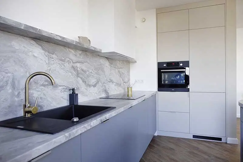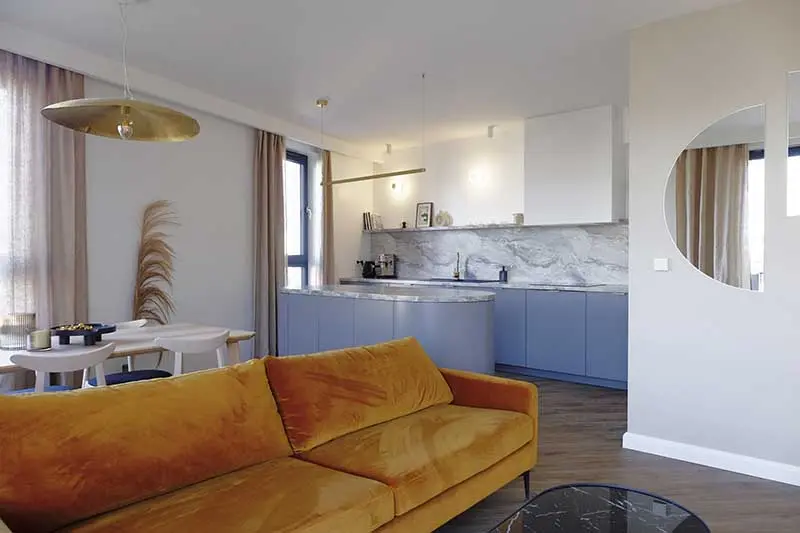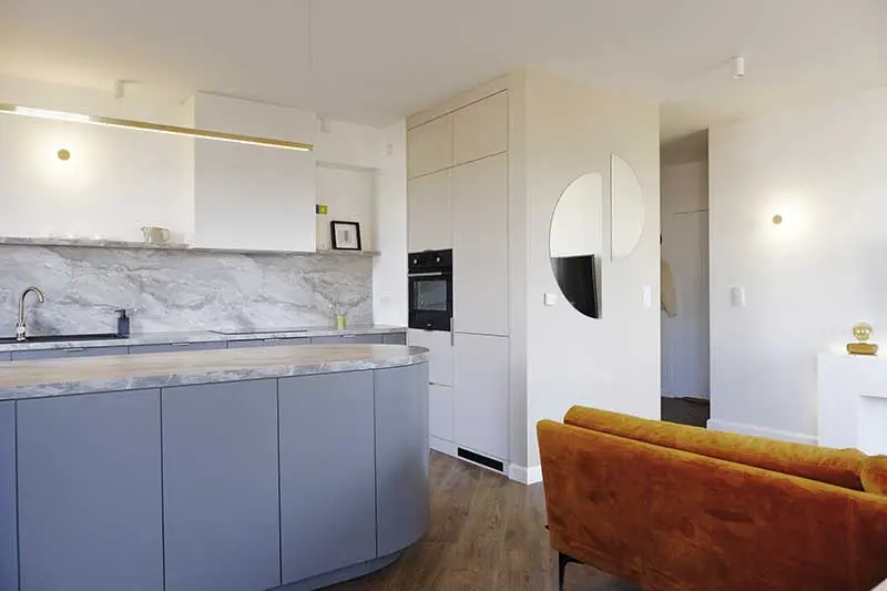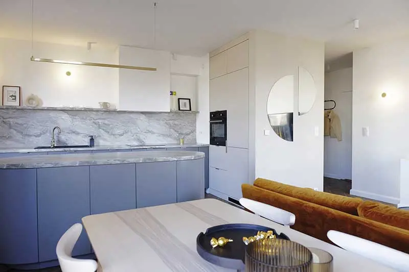 Trochę futurystyczna, oryginalna kuchnia w kolorze jasno niebieskim z zaokrągloną wyspą tworzy przyjemy obraz łagodnego wnętrza. Dzięki dużej wyspie podczas przygotowywania posiłków możemy spędzać czas z rodziną, która przebywa w salonie lub w jadalni.