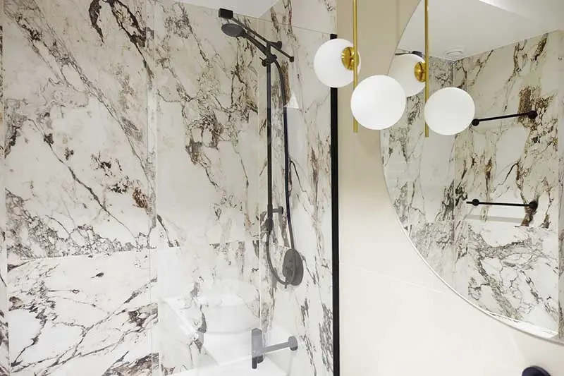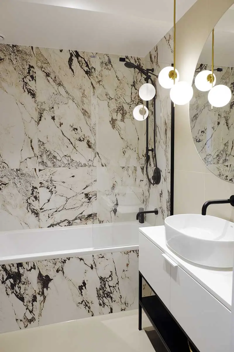 Łazienka minimalistyczny i elegancka. Marmurowe białe płytki z mocnym żyłkowaniem to trend wnętrzarski 2020 roku. Czarna minimalistyczna, nowoczesna armatura przełamuję styl klasyczny wnętrza.