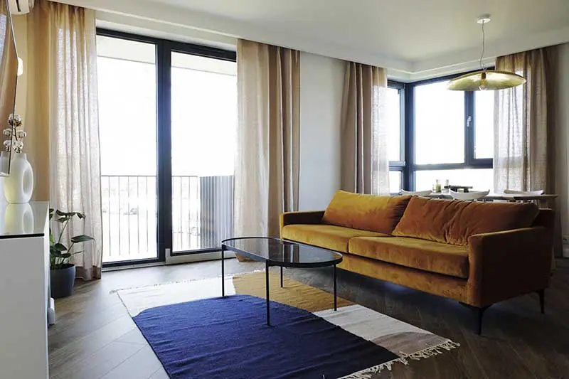 W salonie znajduję się królowa wnętrza, welurowa sofa w szlachetnym kolorze miedzi. Poczucie przytulności dodają wszelkiego rodzaju dodatki o różnych strukturach oraz kolory jak ciepłe brązy, beże czy szarości.
