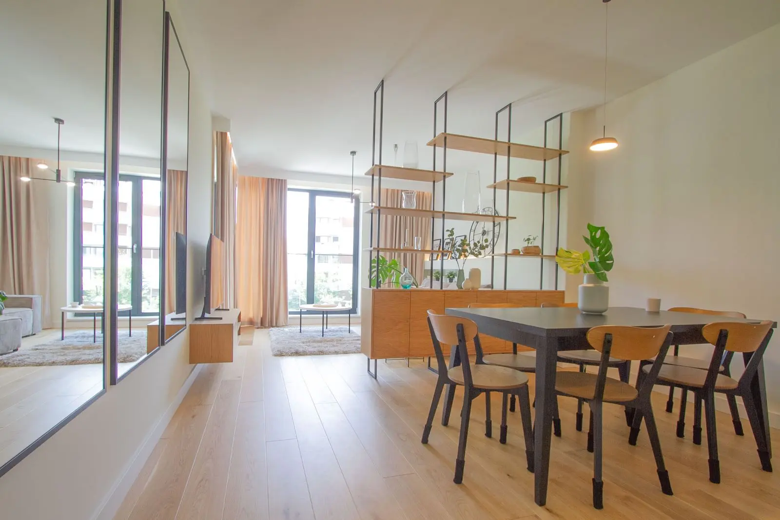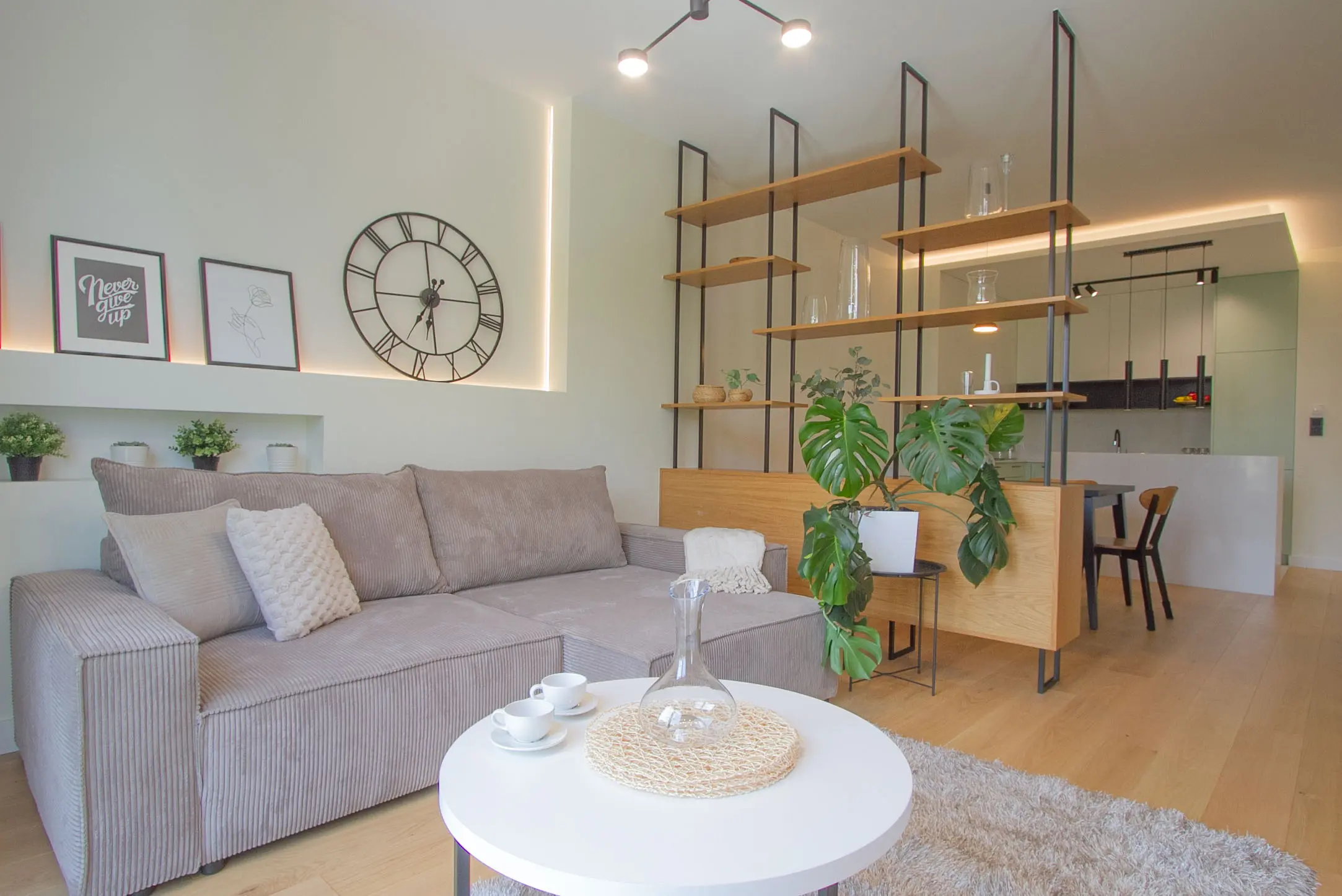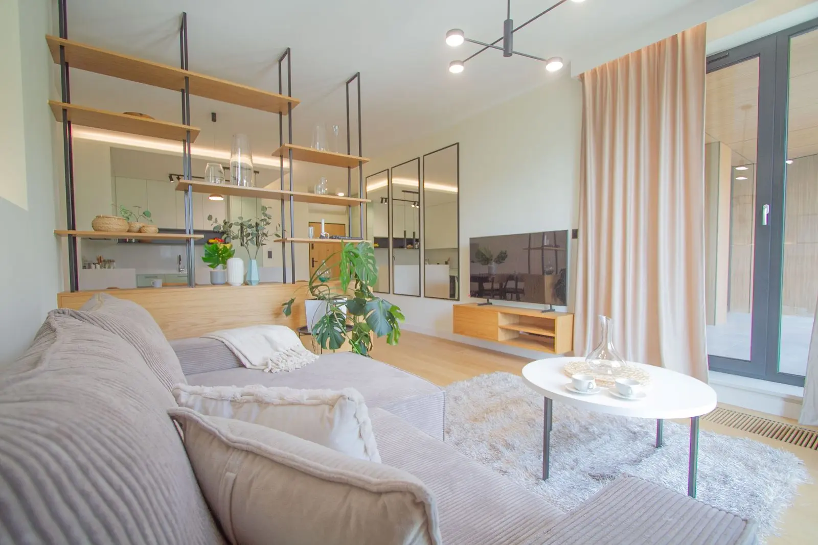 W sercu nowoczesnego mieszkania znajduje się strefa wypoczynkowa, wyodrębniona za pomocą ażurowego regału. To rozwiązanie idealnie wpisuje się w nowoczesny styl, łącząc funkcjonalność z estetyką. Regał nie tylko pełni rolę praktycznego przechowywania, ale także subtelnie dzieli przestrzeń, jednocześnie pozwalając światłu swobodnie przenikać między strefami. Taka przestrzeń zachęca do relaksu, a jednocześnie utrzymuje otwarty i lekki charakter mieszkania.