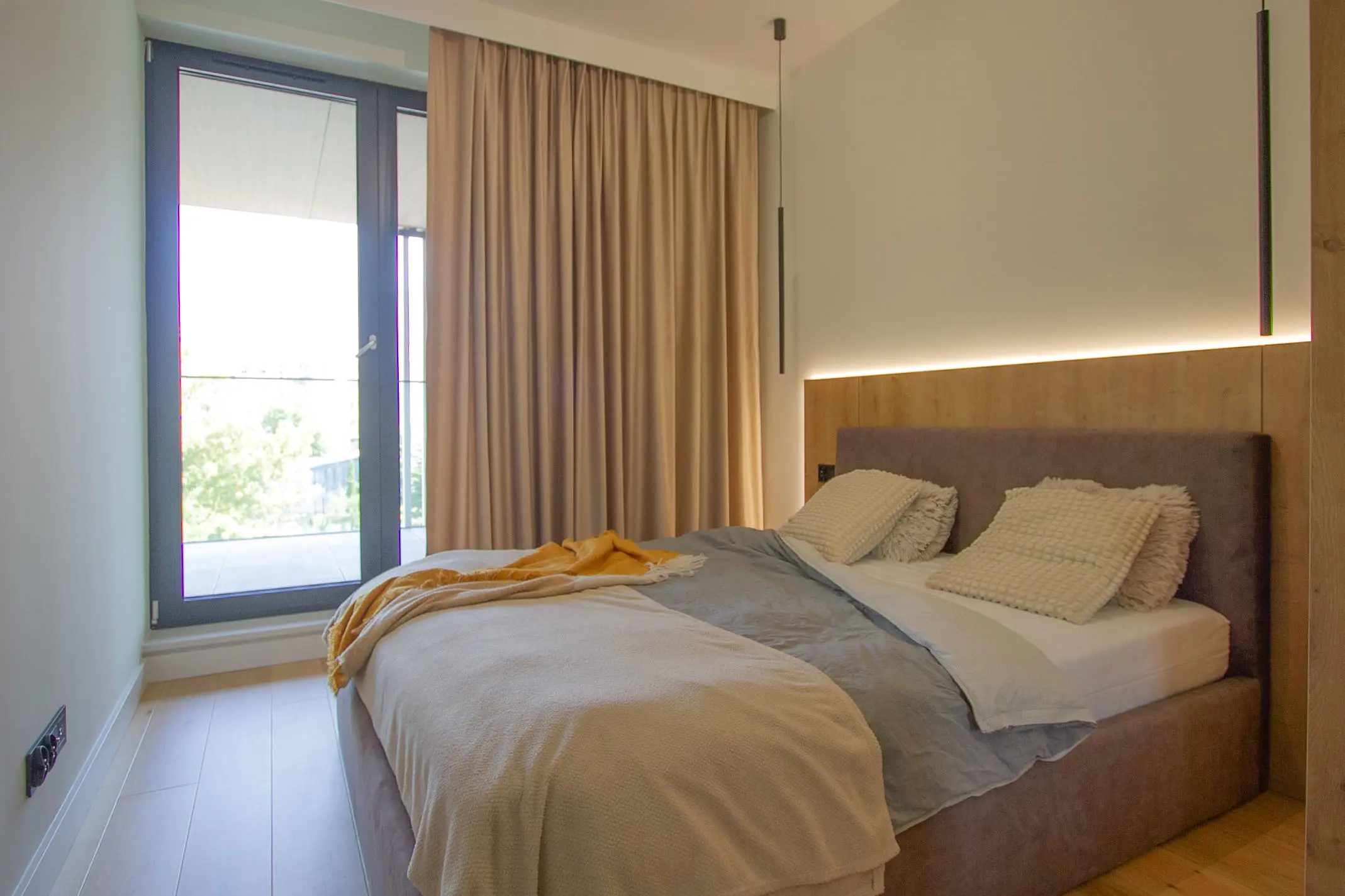 Sypialnia to przestrzeń, która powinna sprzyjać wyciszeniu i relaksowi, dlatego kluczowe jest tu stworzenie przytulnej atmosfery. Nowoczesne rozwiązania pozwalają na uzyskanie harmonii dzięki zastosowaniu miękkich tkanin, ciepłych odcieni i delikatnego oświetlenia. Naturalne światło dzienne, wpadające przez duże okna, w ciągu dnia wypełnia wnętrze energią, natomiast wieczorem miękkie zasłony i subtelne lampy tworzą przytulną, intymną atmosferę, idealną do odpoczynku.